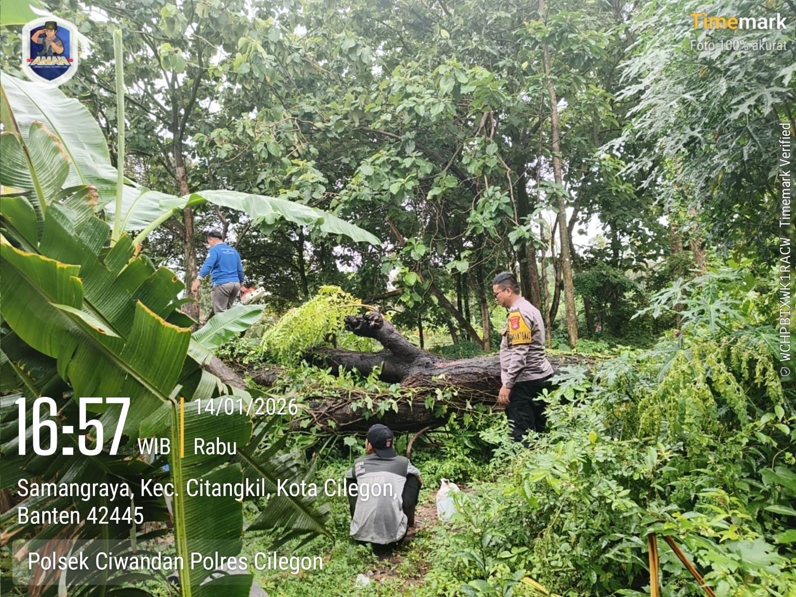 Cilegon - Bhabinkamtibmas Kelurahan Samangraya BRIPKA Marisco bersama Tagana Kota Cilegon dan perangkat RW dan RT, membantu membersihkan area rumah Sdri. IIN yang tertimpa pohon tumbang di Link. Kubang Welut Rt 06/04 Kel. Samangraya. Kamis (15/01/2026).Kejadian itu terjadi sekitar pukul 01.00 WIB, menyebabkan genteng atap dapur rusak. Kerugian materiil diperkirakan Rp...