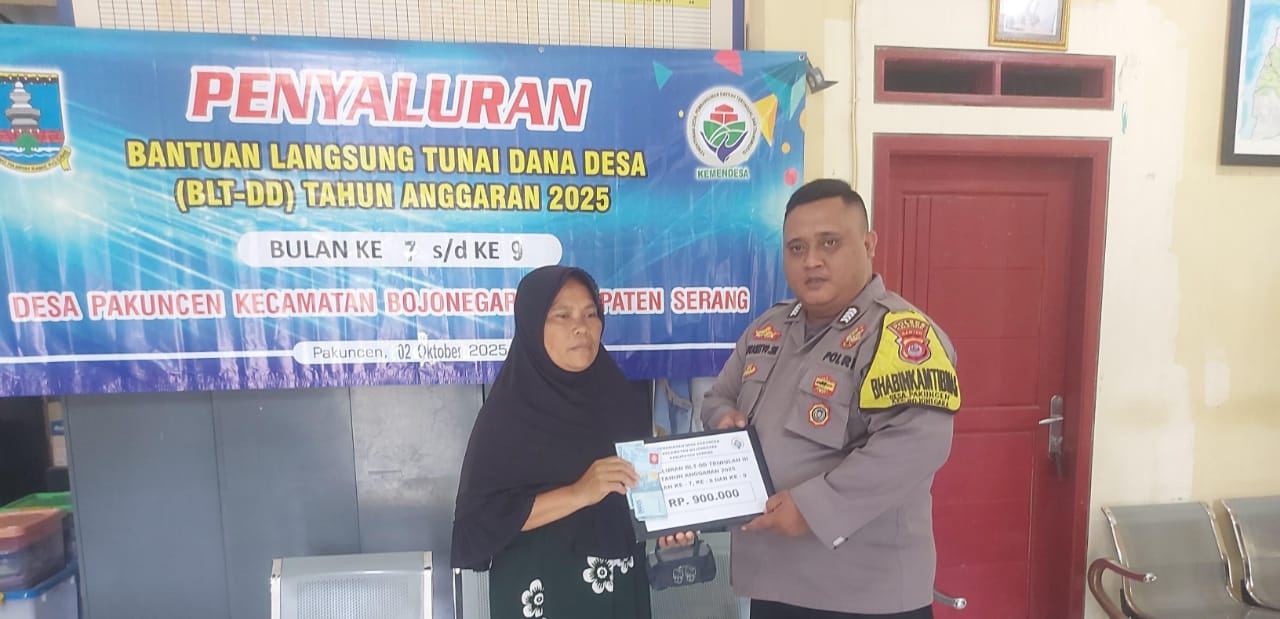Cilegon ~ Personel Bhabinkamtibmas Polsek Bojonegara Polres Cilegon Polda Banten, melaksanakan kegiatan pengamanan dan pengawalan penyaluran Bantuan Langsung Tunai Dana Desa (BLT-DD) di Desa Pakuncen , sebagai upaya dalam menghadirkan rasa aman bagi warga masyarakat penerima bantuan tersebut. Jumat (03/10/2025).