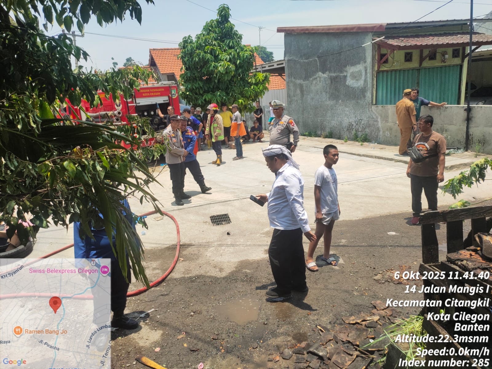 Cilegon - Polsek Ciwandan merespons cepat kebakaran warung dan dapur rumah milik Sdri. Mas'ah di Link Tegal Cabe, Kelurahan Citangkil, Kecamatan Citangkil, Kota Cilegon, pada Senin, 6 Oktober 2025. Api berhasil dipadamkan setelah tiga unit mobil pemadam kebakaran tiba di lokasi,Senin (06/10/2025).