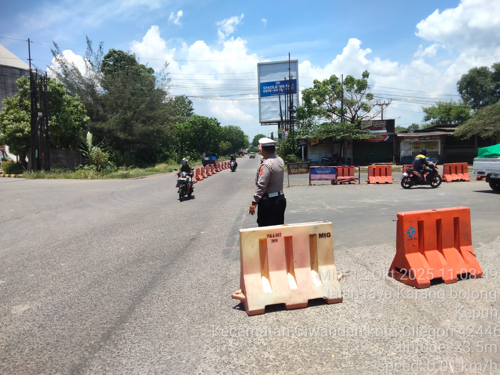Cilegon - Personil Unit Lantas Polsek Ciwandan Polres Cilegon Polda Banten melaksanakan kegiatan monitoring jalur wisata di depan Pos Lantas JLS Ciwandan, Minggu, (12/10/2025).