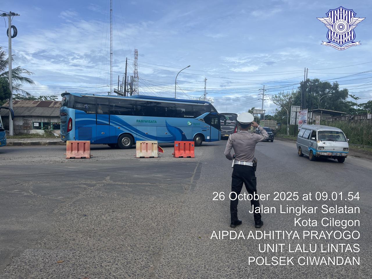 Cilegon - Weekend kali ini Personil Unit Lantas Polsek Ciwandan Polres Cilegon Polda Banten melaksanakan pengaturan lalu lintas di Simpang JLS tepatnya di Pertigaan depan PT. Semen Indonesia Demi Kelancaran Arus Lalu-lintas Wisata, Minggu (26/10/2025).