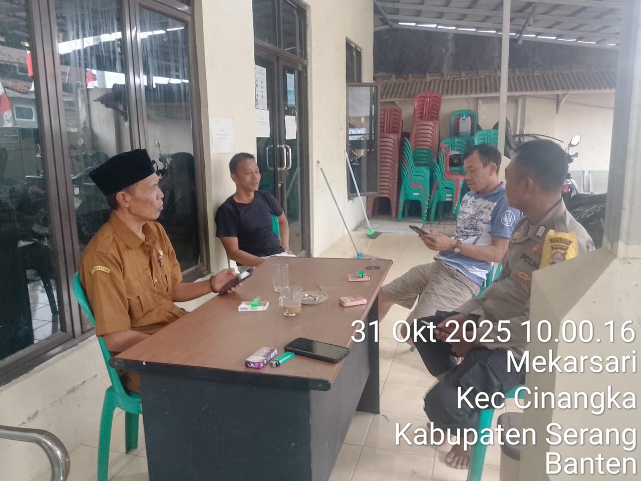 *CILEGON* dalam Rangka Mengantisipasi Gktm di wilayah Personil Bhabinkamtibmas Cinangka melakukan patroli Dialogis dengan Kepala Desa dan warga dan Menanyakan situasi Kamtibmas di wilayah dalam Rangka Menjaga Harkamtibmas di Desa Binaannya Kecamatan Cinangka Kab. Serang. Jumat.(31/10/2025).