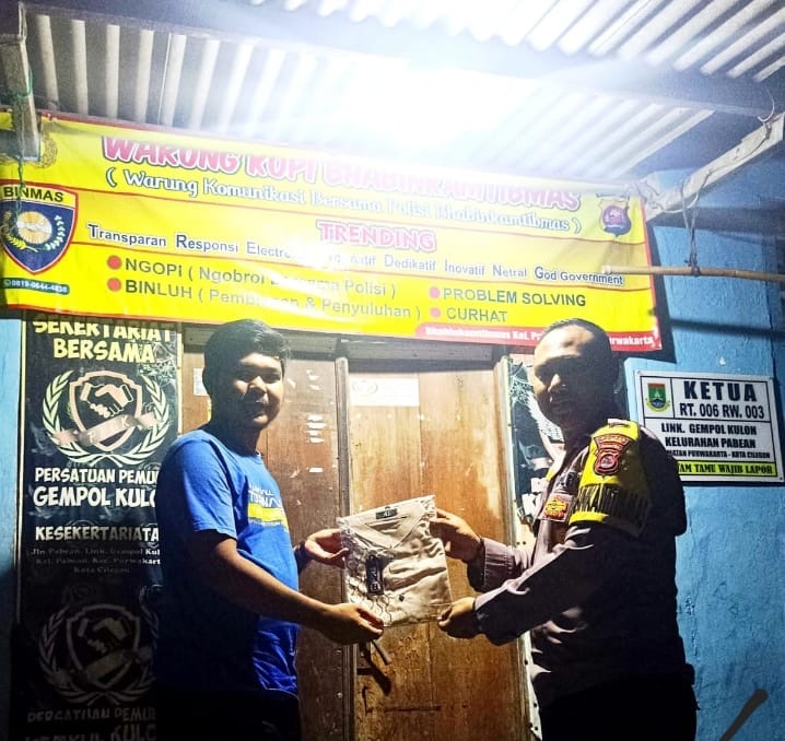 POLRES CILEGON–Polda Banten Aipda Anton Sutradjat, Bhabinkamtibmas Kelurahan Pabean, Polsek Purwakarta, Polres Cilegon, melaksanakan kegiatan sambang ke warung kopi Bhabinkamtibmas di lingkungan Gempol Kulon, Kelurahan Pabean, Kecamatan Purwakarta, Kota Cilegon. Dalam kesempatan tersebut, Aipda Anton berbincang santai dengan warga serta memberikan bantuan sarana kontak berupa baju koko kepada salah satu warga binaannya.Sabtu.(01-11-2025).