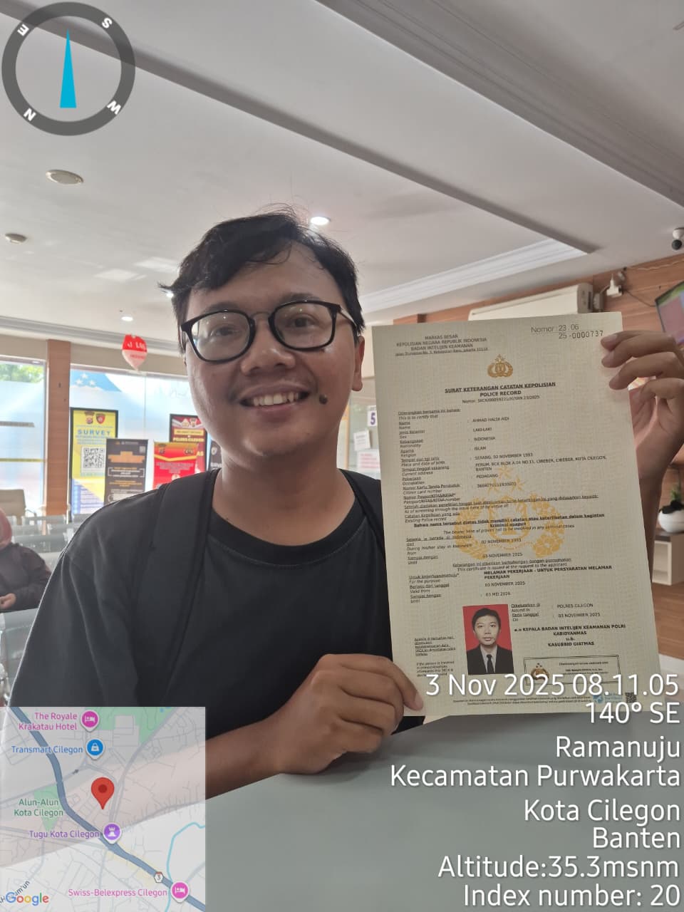 CILEGON - Testimoni penerbitan Surat Keterangan Catatan Kepolisian (SKCK) berbasis online. Sistem itu mulai diberlakukan awal November 2025, seluruh proses pendaftaran SKCK di wilayah hukum Polres Cilegon wajib dilakukan melalui Aplikasi Super App Polri versi terbaru (SKCK Full Online).