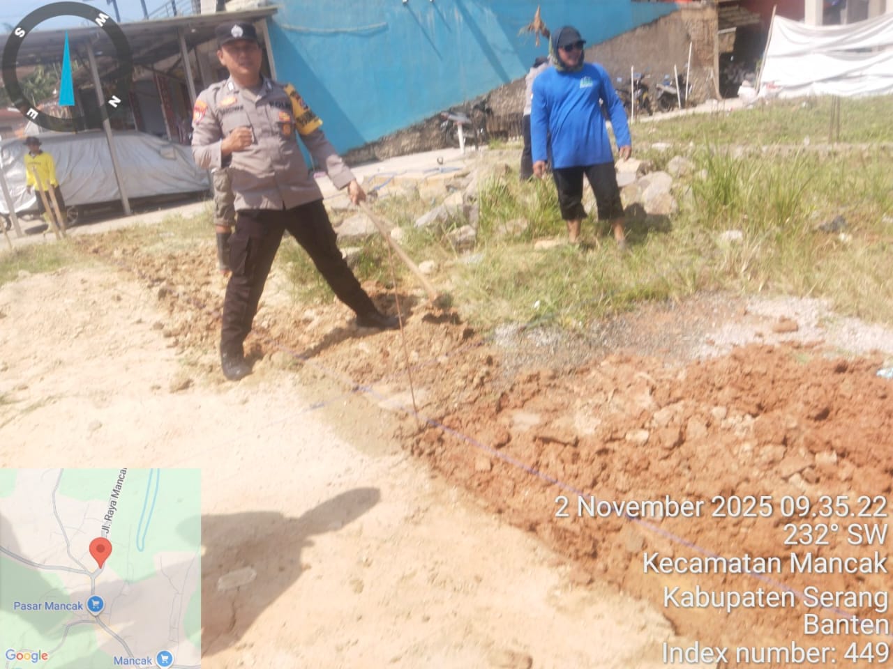 Kapolres Cilegon Polda Banten AKBP Dr. Martua Raja Taripar Laut Silitonga melalui Kapolsek mancak IPTU KHAIRUL ,Beserta Bhabinkamtibmas BRIPKA DARSIWAN, Melaksanakan Kegiatan  Sambang dan Melaksanakan giat gotong royong Kp. Prapatan Rt. 002/001 Ds. Mancak Kec. Mancak Kab. Serang, bersama kepala desa dan staf desa mancak._ Polres Cilegon.*-