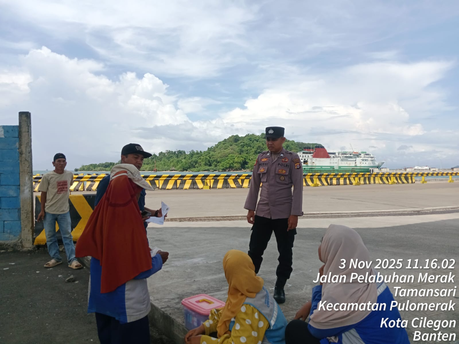 Cilegon - Personel Polsek Kskp Merak Polres Cilegon Polda Banten melaksanakan sambang dan patroli kawasan pelabuhan merak dalam rangka menjaga Harkamtibmas di Kawasan Pelabuhan Merak, Senin (03/11/2025).