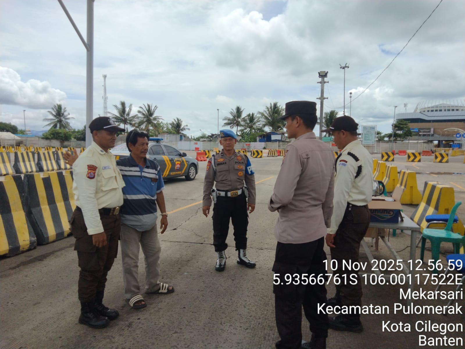 Cilegon - Personel Polsek Kskp Merak Polres Cilegon Polda Banten melaksanakan sambang dan patroli kawasan pelabuhan merak dalam rangka menjaga Harkamtibmas di Kawasan Pelabuhan Merak, Senin (10/11/2025).