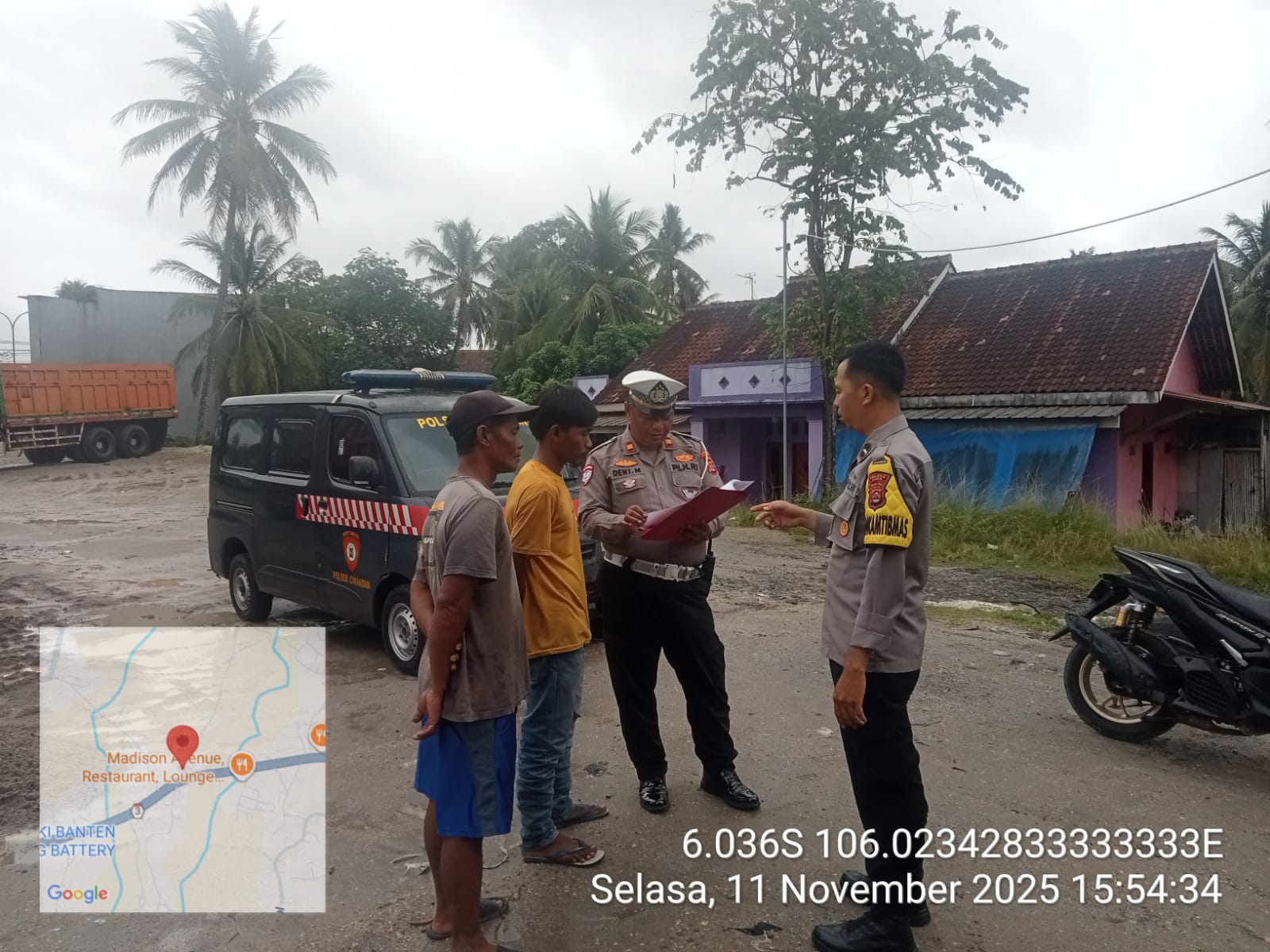 Cilegon - Panit Lantas Polsek Ciwandan IPTU Deni Mulyana dan Bhabinkamtibmas Kelurahan Tamanbaru AIPDA Ediyanto melaksanakan monitoring stokfile pasir di Lingkungan Kubang Lesung Pabuaran PT. Pamungkas Perkasa, Kelurahan Tamanbaru, Kecamatan Citangkil, Kota Cilegon, Selasa (11/11/2025).