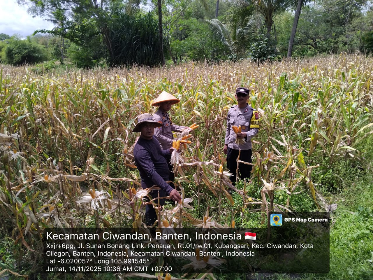Cilegon - Polsek Ciwandan Polres Cilegon Polda Banten mendukung kegiatan panen jagung Hibrida hasil penanaman Kelompok Tani Kubang Lestari I di Kelurahan Kubangsari Kecamatan Ciwandan, Kota Cilegon, Jum’at (14/11/2025).