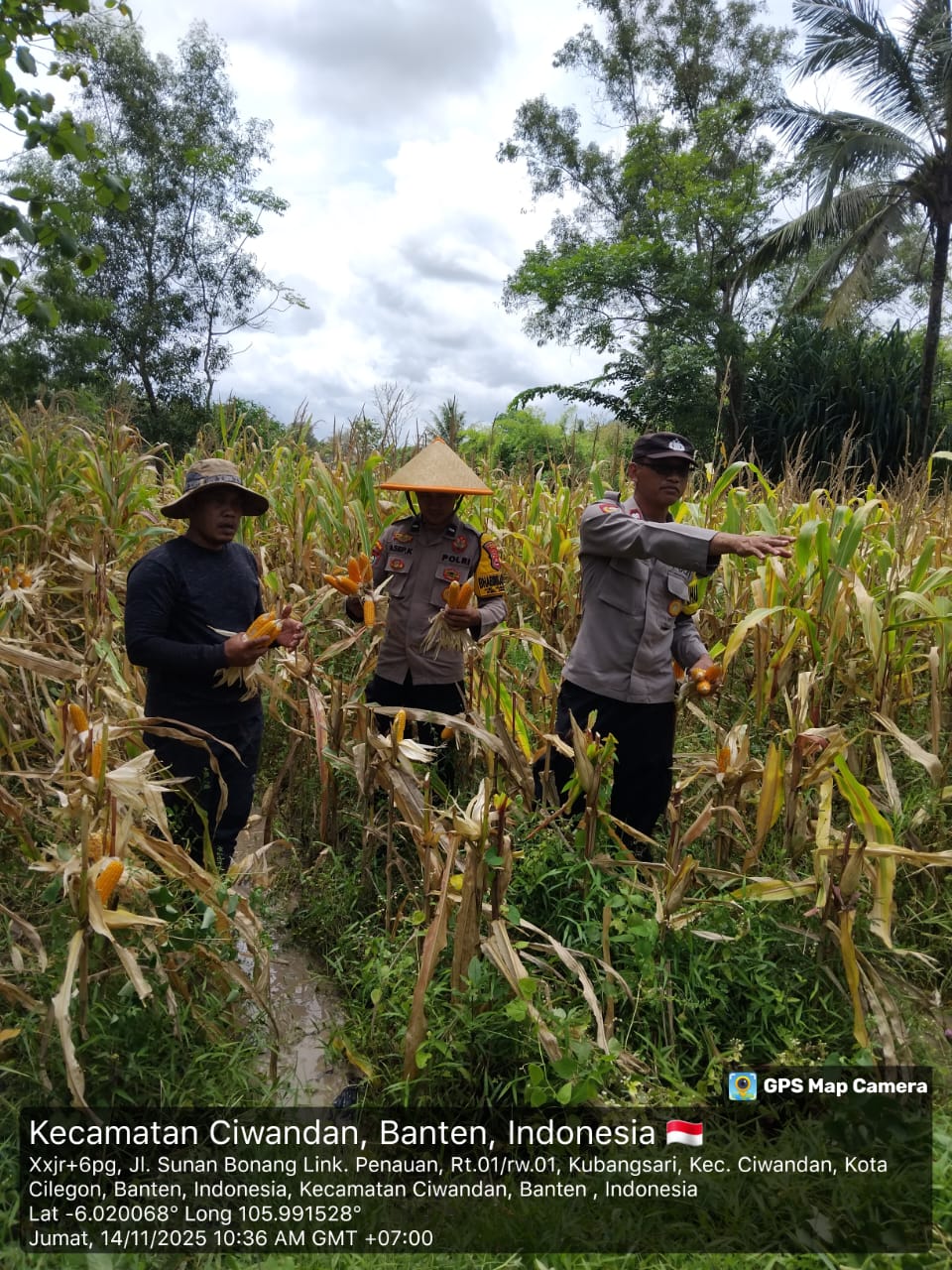 Cilegon - Polsek Ciwandan Polres Cilegon Polda Banten mendukung kegiatan panen jagung Hibrida hasil penanaman Kelompok Tani Kubang Lestari I di Kelurahan Kubangsari Kecamatan Ciwandan, Kota Cilegon, Jum’at (14/11/2025).