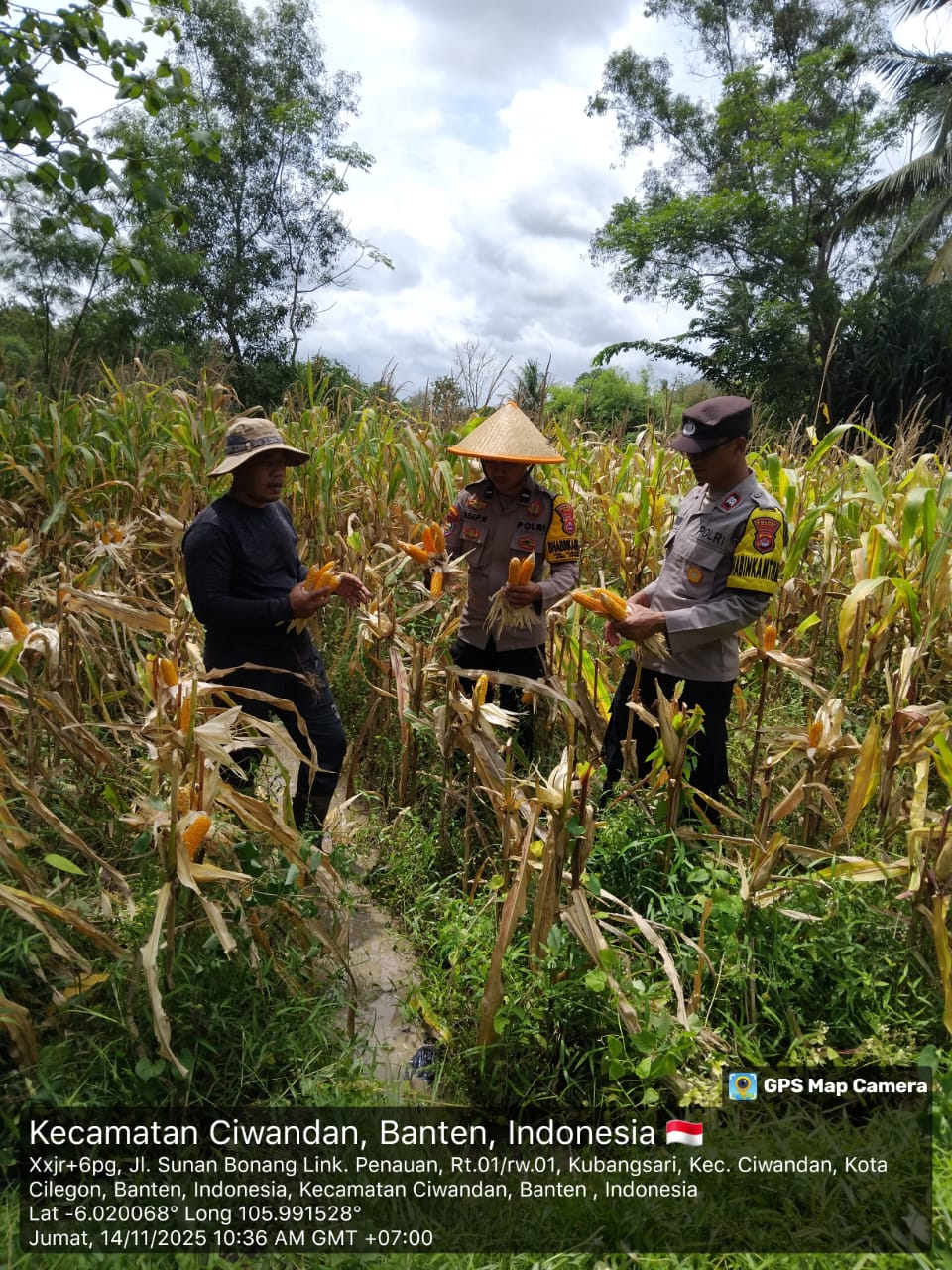 Cilegon - Polsek Ciwandan Polres Cilegon Polda Banten mendukung kegiatan panen jagung Hibrida hasil penanaman Kelompok Tani Kubang Lestari I di Kelurahan Kubangsari Kecamatan Ciwandan, Kota Cilegon, Jum’at (14/11/2025).