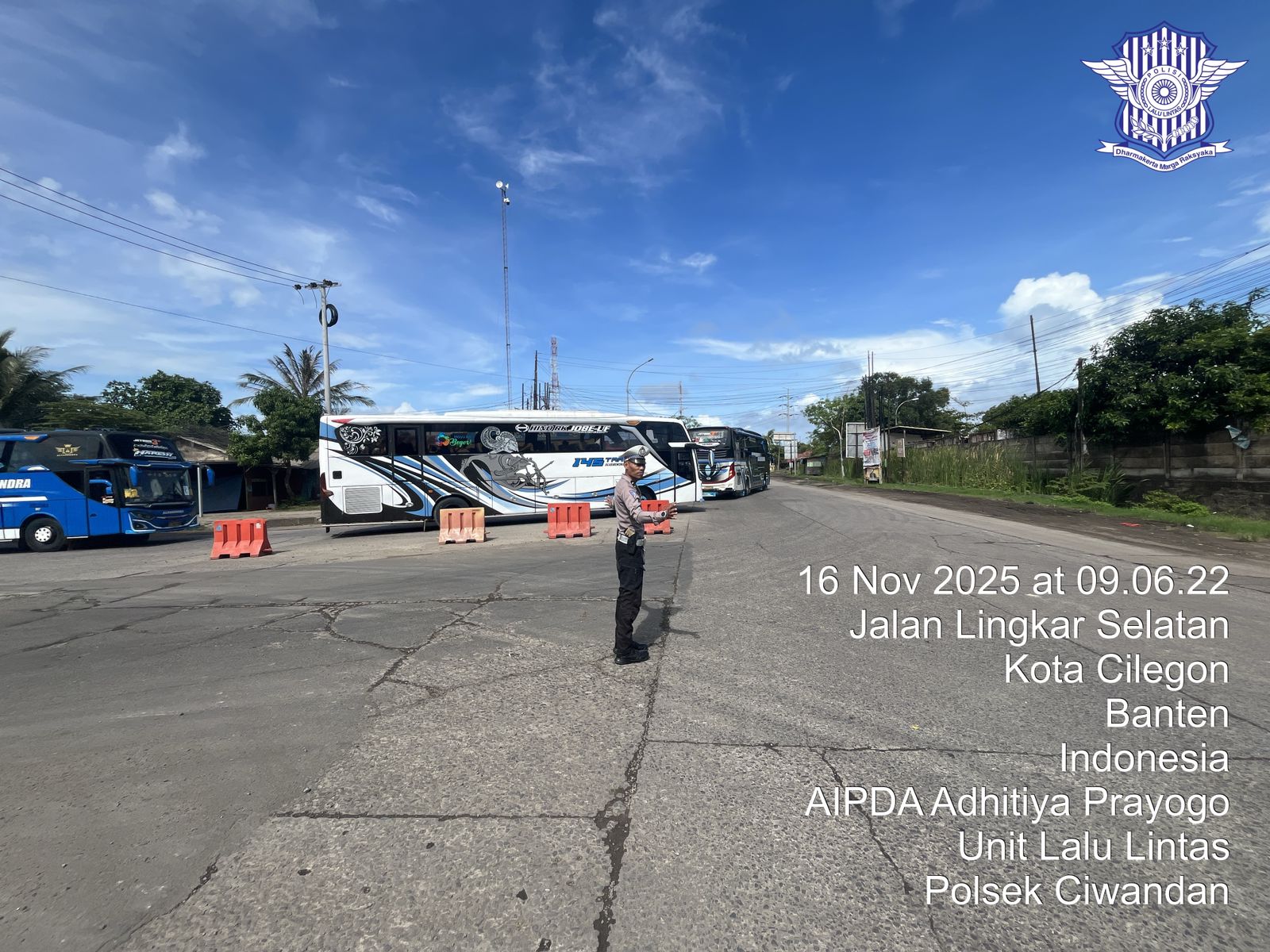 Cilegon - Personil Unit Lantas Polsek Ciwandan Polres Cilegon Polda Banten melaksanakan kegiatan monitoring jalur wisata di depan Pos Lantas JLS Ciwandan, Minggu, (16/11/2025).