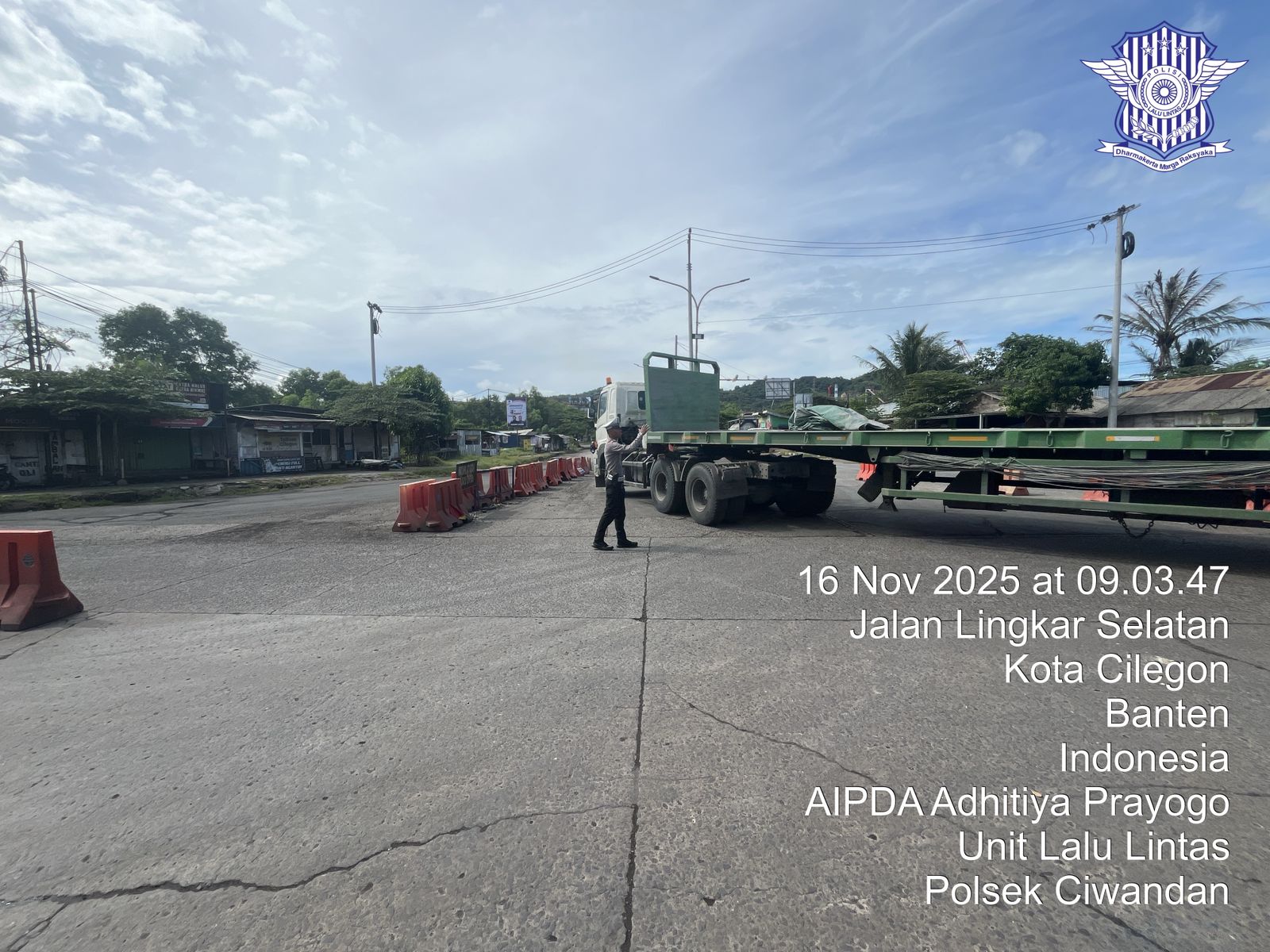 Cilegon - Personil Unit Lantas Polsek Ciwandan Polres Cilegon Polda Banten melaksanakan kegiatan monitoring jalur wisata di depan Pos Lantas JLS Ciwandan, Minggu, (16/11/2025).