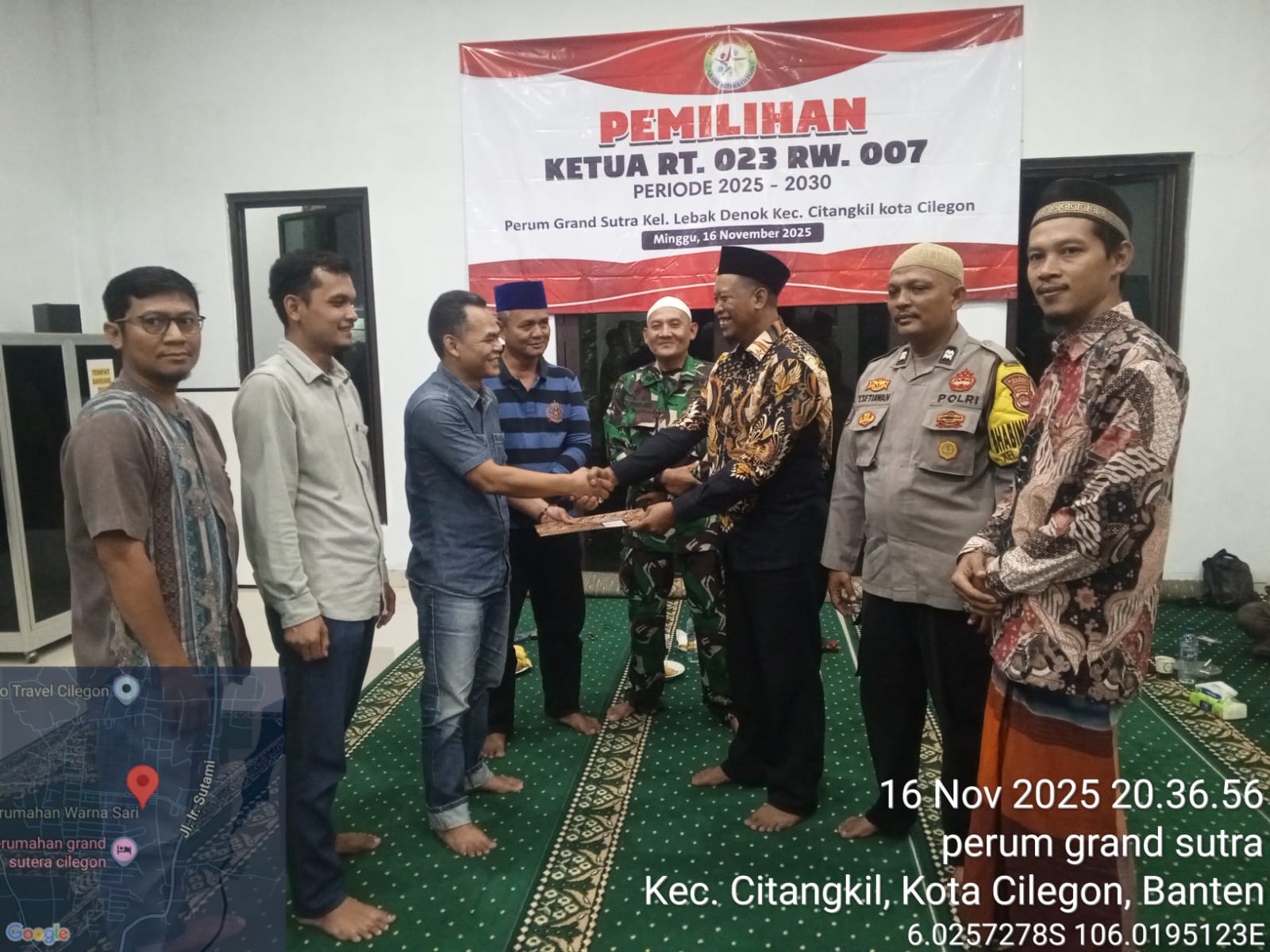 Cilegon - Bhabinkamtibmas Kelurahan Lebak Denok Polsek Ciwandan Polres Cilegon Polda Banten AIPTU Yudi Setiawan menghadiri pemilihan Ketua RT Lingkungan Perumahan Grand Sutera kelurahan Lebak Denok Kecamatan Citangkil Kota Cilegon, Senin (17/11/2025).