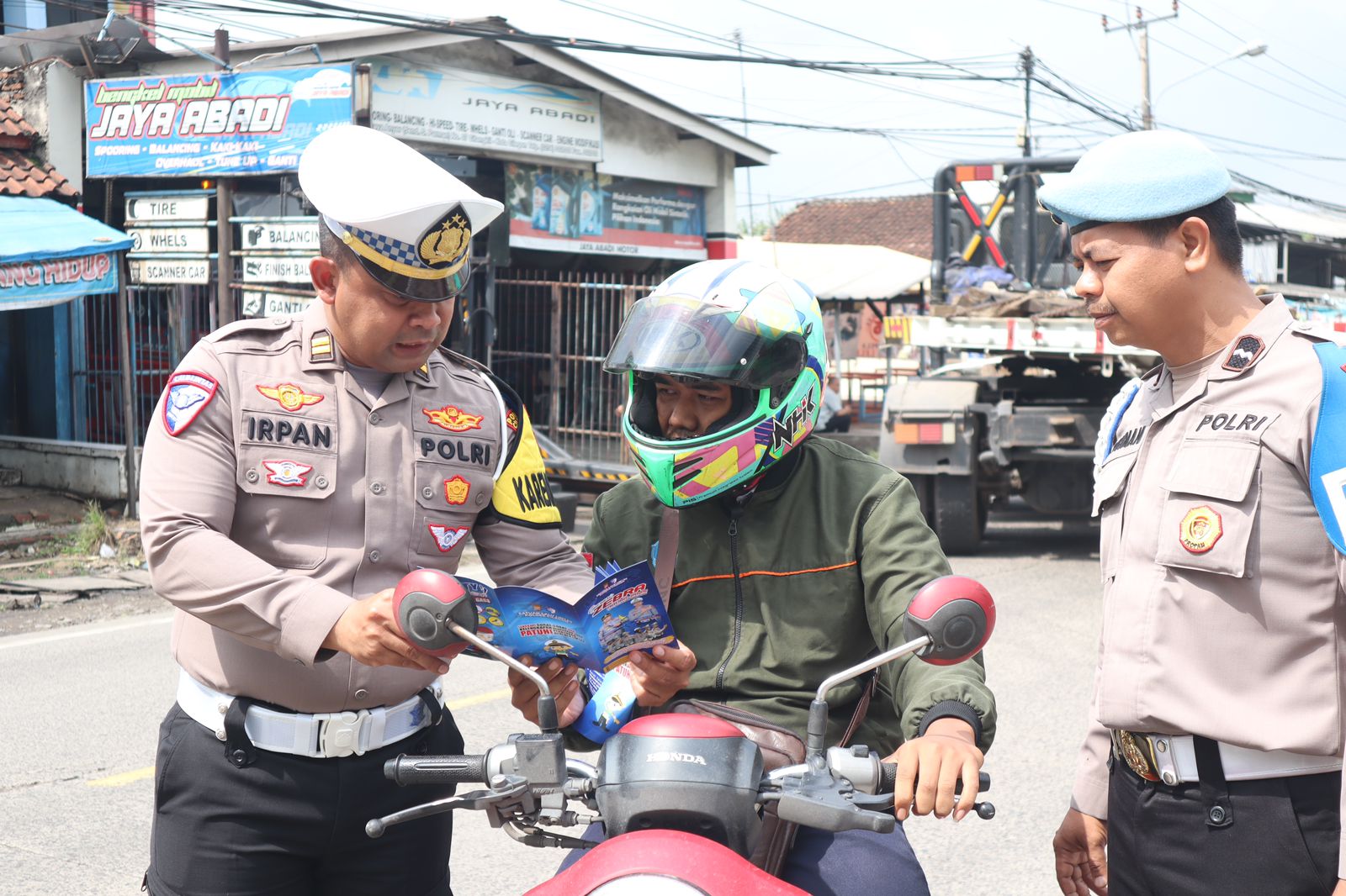 Petugas kemudian membagikan leaflet dan menempelkan stiker imbauan keselamatan kepada pengguna jalan yang melintas. Edukasi langsung juga diberikan, terutama kepada para pengendara roda dua yang belum memahami pentingnya penggunaan helm berstandar SNI dan mematuhi peraturan dasar berkendara.