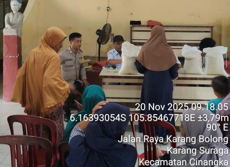 *Polres Cilegon* - Bhabinkamtibmas Desa Karagsuraga Polsek Cinangka Polres Cilegon Polda Banten Bripka Oki Berikan Pengamanan, Monitoring dan Kawal Pelaksanaan Penyaluran Bantuan Pangan Non Tunai Dari Badan Pangan Nasional Di Aula kantor Desa Karangsuraga kecamatan Cinangka Kab Serang, Kamis (20/11/2025).