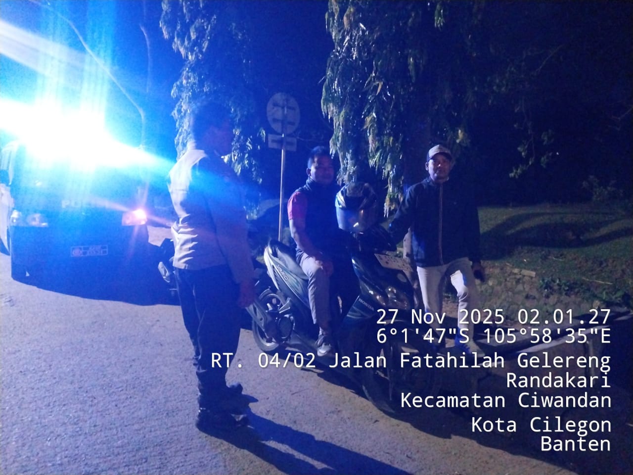 Cilegon - Personil Polsek Ciwandan Polres Cilegon Polda Banten Dalam Pelaksanaan Kegiatan Patroli dengan menyalakan lampu rotator berwarna biru di Daerah Hukum Polsek Ciwandan Polres Cilegon Polda Banten dari malam hingga dini hari, dalam rangka menciptakan situasi aman dan kondusif, Kamis (27/11/2025).