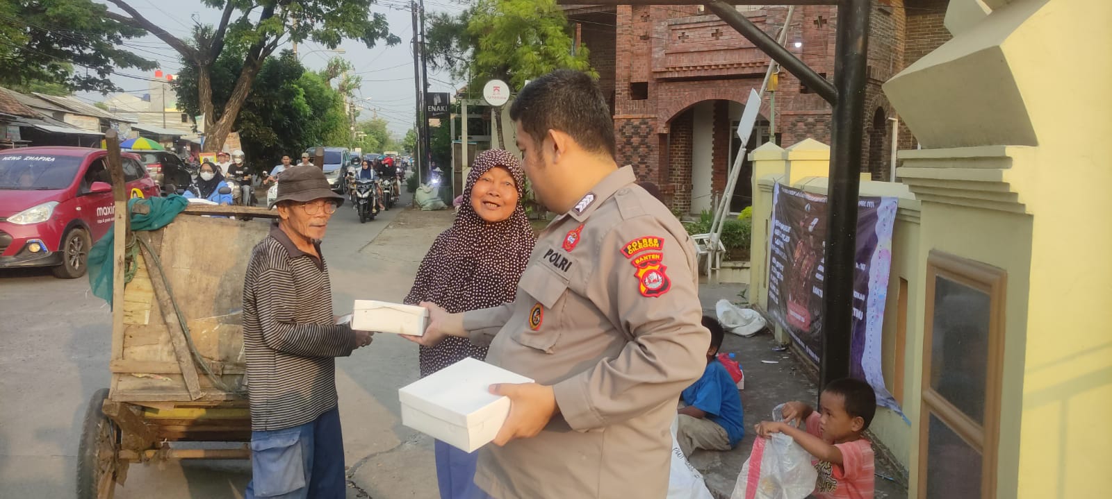 Kapolres Cilegon AKBP Martua Raja Taripar Laut Silitonga Melalui Kapolsek Cibeber Polres Cilegon Polda Banten  AKP Atep Mulyana menyampaikan Pembagian nasi kotak kepada masyarakat yang melintas depan Mako Polsek Cibeber .