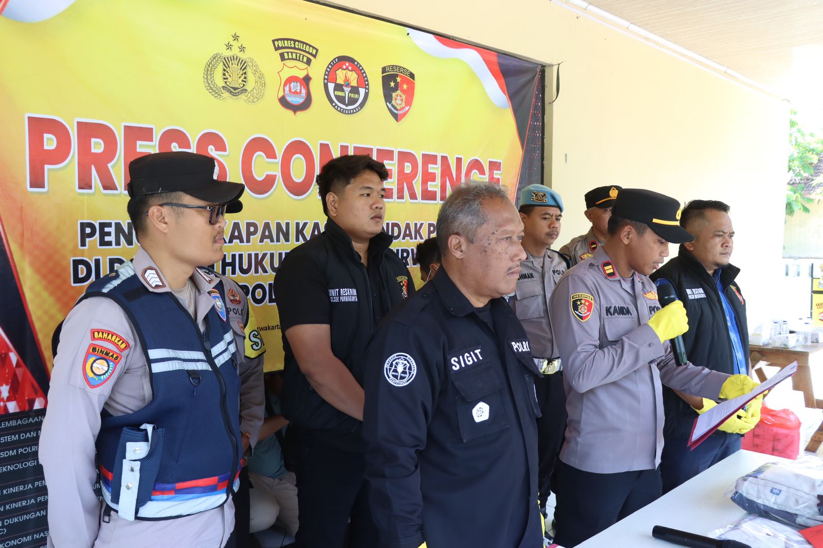 Kapolsek Purwakarta Polres Cilegon Polda Banten IPTU Sukanda .S.M Pada saat press confrence pengungkapan kasus Pencurian HP yang terjadi di alun alun kota Cilegon dalam kegiatan senam bersama hari guru nasional pada hari Senin tanggal 24 November 2025 Pelapor sedang berada di alun-alun kota Cilegon dalam rangka mengikuti kegiatan hari guru,pada saat kegiatan senam bersama, Pelapor sedang membeli makanan di salah satu stand yang ada di lapangan alun-alun tersebut, kemudian ada seseorang yang menyenggol tas ransel Pelapor yang sedang Pelapor pakai di bagian belakang badan Pelapor, lalu pada saat Pelapor duduk mau makan di sekitar stand tersebut, pelapor melihat tas ransel Pelapor dalam keadaan resleting terbuka. Ketika Pelapor mengecek isi dari tas ransel Pelapor, Pelapor tidak menemukan handphone yang sebelumnya Pelapor taruh di dalam tas ransel Pelapor tersebut/hilang, lalu Pelapor dan teman Pelapor Sdr Amirudin mencari keberadaan HP Pelapor yang hilang tersebut, kemudian ada 1 (satu) orang yang Pelapor dan Sdr. Amirudin curigai karena tidak memakai kostum yang seragam dengan peserta yang lainnya, Ketika Pelapor mencurigai 1 (satu) orang tersebut, orang tersebut jalan cepat dan berlari menuju kebelakang kolam air mancur, lalu Sdr. Amirudin melaporkan kepada salah satu anggota polisi yang sedang melakukan pengamanan di sekitar alun-alun tersebut bahwa ada yang dicurigai menjadi pelaku pencurian tersebut. Kemudian ada beberapa anggota polisi yang ikut melakukan pengejaran terhadap terduga pelaku tersebut dan akhirnya terduga pelaku tersebut berhasil diamankan dan di bawa ke pos security, setelah sampai di pos security tas terduga pelaku di buka ternyata benar ada HP Pelapor yang dicuri oleh orang tersebut. Dengan kejadian tersebut pelapor mengalami kerugian sebesar RP 2.600.000 (dua juta enam ratus ribu rupian) dan selanjutnya melaporkan ke Polsek Purwakarta Polres Cilegon Polda Banten