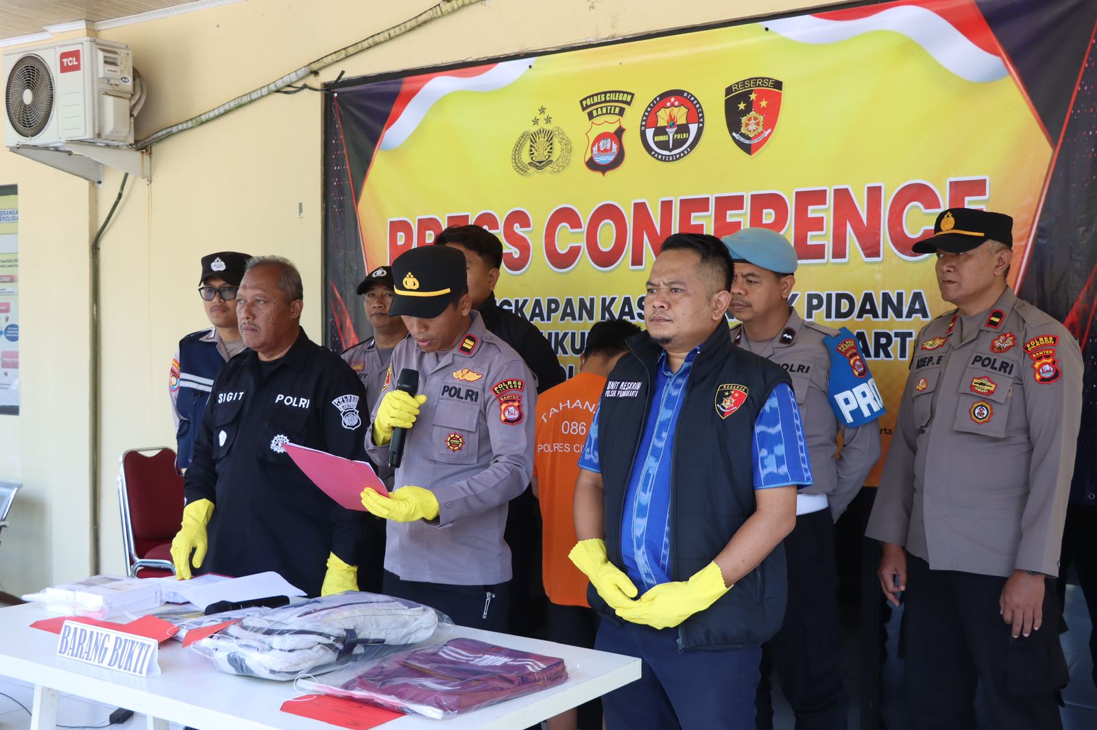 Kapolsek Purwakarta Polres Cilegon Polda Banten IPTU  Sukanda .S.M Pada saat press confrence pengungkapan kasus Pencurian HP yang terjadi di alun alun kota Cilegon dalam kegiatan senam bersama hari guru nasional pada hari Senin tanggal 24 November 2025  Pelapor sedang berada di alun-alun kota Cilegon dalam rangka mengikuti kegiatan hari guru,pada saat kegiatan senam bersama, Pelapor sedang membeli makanan di salah satu stand yang ada di lapangan alun-alun tersebut,  kemudian ada seseorang yang menyenggol tas ransel Pelapor yang sedang Pelapor pakai di bagian belakang badan Pelapor, lalu pada saat Pelapor duduk mau makan di sekitar stand tersebut, pelapor melihat tas ransel Pelapor dalam keadaan resleting terbuka. Ketika Pelapor mengecek isi dari tas ransel Pelapor, Pelapor tidak menemukan handphone yang sebelumnya Pelapor taruh di dalam tas ransel Pelapor tersebut/hilang, lalu Pelapor dan teman Pelapor Sdr Amirudin  mencari keberadaan HP Pelapor yang hilang tersebut, kemudian ada 1 (satu) orang yang Pelapor dan Sdr. Amirudin curigai karena tidak memakai kostum yang seragam dengan peserta yang lainnya, Ketika Pelapor mencurigai  1 (satu) orang tersebut, orang tersebut jalan cepat dan berlari menuju kebelakang kolam air mancur, lalu Sdr. Amirudin melaporkan kepada salah satu anggota polisi yang sedang melakukan pengamanan di sekitar alun-alun tersebut bahwa ada yang dicurigai menjadi pelaku pencurian tersebut. Kemudian ada beberapa anggota polisi yang ikut melakukan pengejaran terhadap terduga pelaku tersebut dan akhirnya terduga pelaku tersebut berhasil diamankan dan di bawa ke pos security, setelah sampai di pos security tas terduga pelaku di buka ternyata benar ada HP Pelapor yang dicuri oleh orang tersebut. Dengan kejadian tersebut pelapor mengalami kerugian sebesar RP 2.600.000 (dua juta enam ratus ribu rupian) dan selanjutnya melaporkan ke Polsek Purwakarta Polres Cilegon Polda Banten