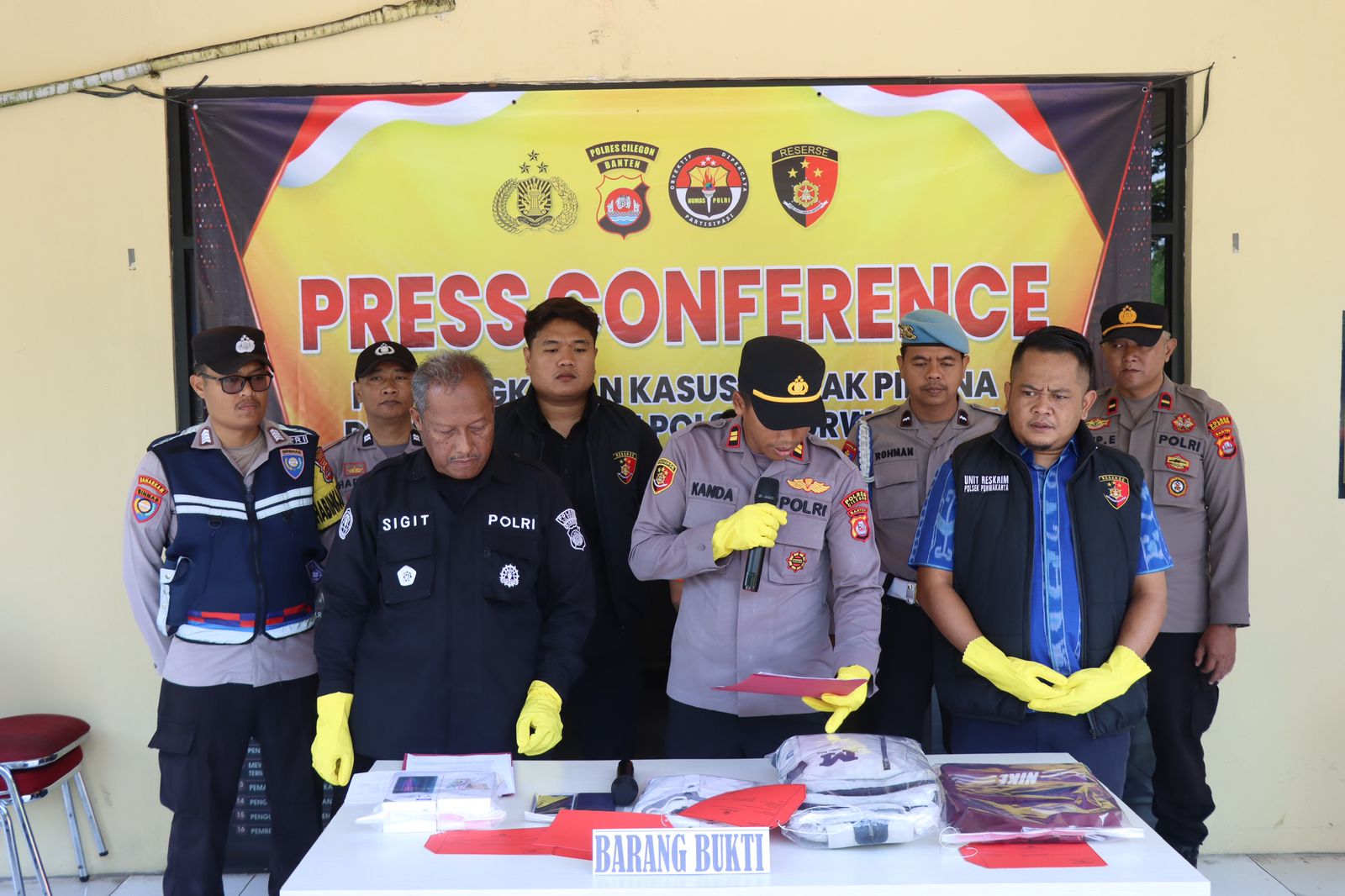 Kapolsek Purwakarta Polres Cilegon Polda Banten IPTU  Sukanda .S.M Pada saat press confrence pengungkapan kasus Pencurian HP yang terjadi di alun alun kota Cilegon dalam kegiatan senam bersama hari guru nasional pada hari Senin tanggal 24 November 2025  Pelapor sedang berada di alun-alun kota Cilegon dalam rangka mengikuti kegiatan hari guru,pada saat kegiatan senam bersama, Pelapor sedang membeli makanan di salah satu stand yang ada di lapangan alun-alun tersebut,  kemudian ada seseorang yang menyenggol tas ransel Pelapor yang sedang Pelapor pakai di bagian belakang badan Pelapor, lalu pada saat Pelapor duduk mau makan di sekitar stand tersebut, pelapor melihat tas ransel Pelapor dalam keadaan resleting terbuka. Ketika Pelapor mengecek isi dari tas ransel Pelapor, Pelapor tidak menemukan handphone yang sebelumnya Pelapor taruh di dalam tas ransel Pelapor tersebut/hilang, lalu Pelapor dan teman Pelapor Sdr Amirudin  mencari keberadaan HP Pelapor yang hilang tersebut, kemudian ada 1 (satu) orang yang Pelapor dan Sdr. Amirudin curigai karena tidak memakai kostum yang seragam dengan peserta yang lainnya, Ketika Pelapor mencurigai  1 (satu) orang tersebut, orang tersebut jalan cepat dan berlari menuju kebelakang kolam air mancur, lalu Sdr. Amirudin melaporkan kepada salah satu anggota polisi yang sedang melakukan pengamanan di sekitar alun-alun tersebut bahwa ada yang dicurigai menjadi pelaku pencurian tersebut. Kemudian ada beberapa anggota polisi yang ikut melakukan pengejaran terhadap terduga pelaku tersebut dan akhirnya terduga pelaku tersebut berhasil diamankan dan di bawa ke pos security, setelah sampai di pos security tas terduga pelaku di buka ternyata benar ada HP Pelapor yang dicuri oleh orang tersebut. Dengan kejadian tersebut pelapor mengalami kerugian sebesar RP 2.600.000 (dua juta enam ratus ribu rupian) dan selanjutnya melaporkan ke Polsek Purwakarta Polres Cilegon Polda Banten