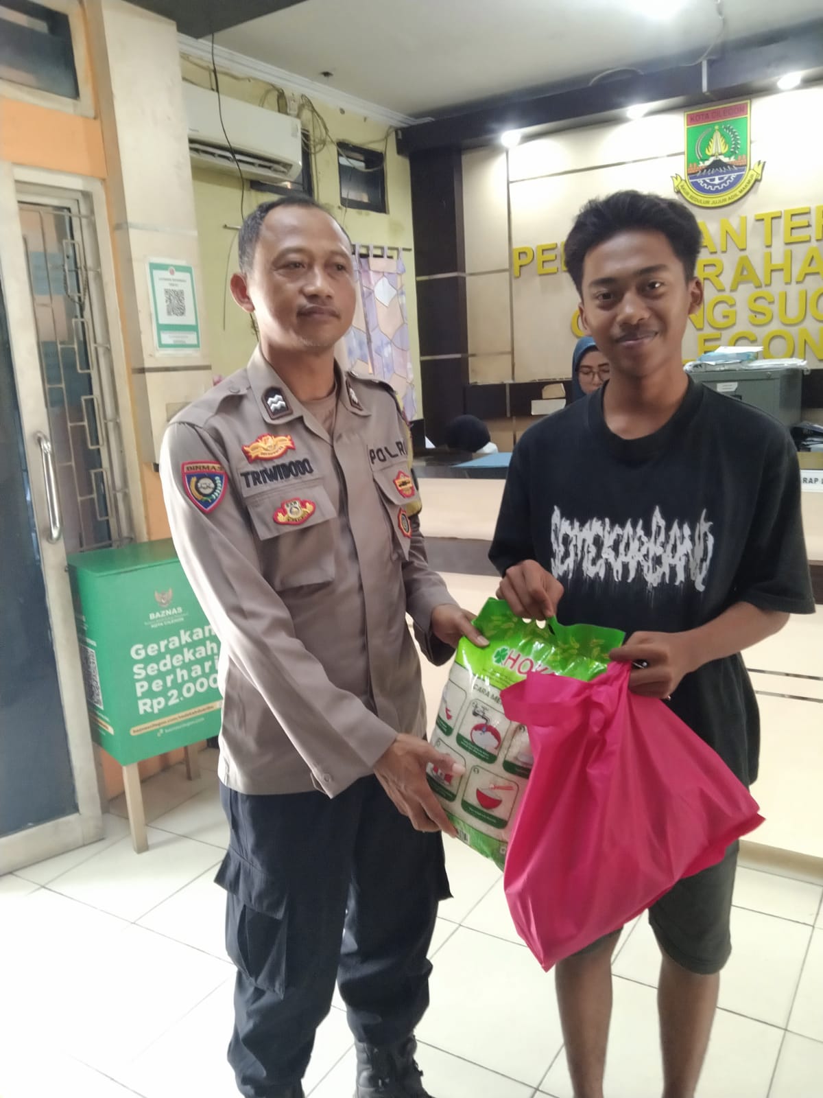 Cilegon - Bhabinkamtibmas Kel. Gunung Sugih, Aiptu Tri Widodo, mendampingi Dinsos memberikan bantuan kepada 24 warga terdampak banjir di Lingkungan Gambiran (16 warga) dan Cilodan (8 warga), Kel. Gunung Sugih, Ciwandan. Banjir terjadi akibat hujan lebat yang melanda wilayah tersebut, Jum'at (19/12/2025).