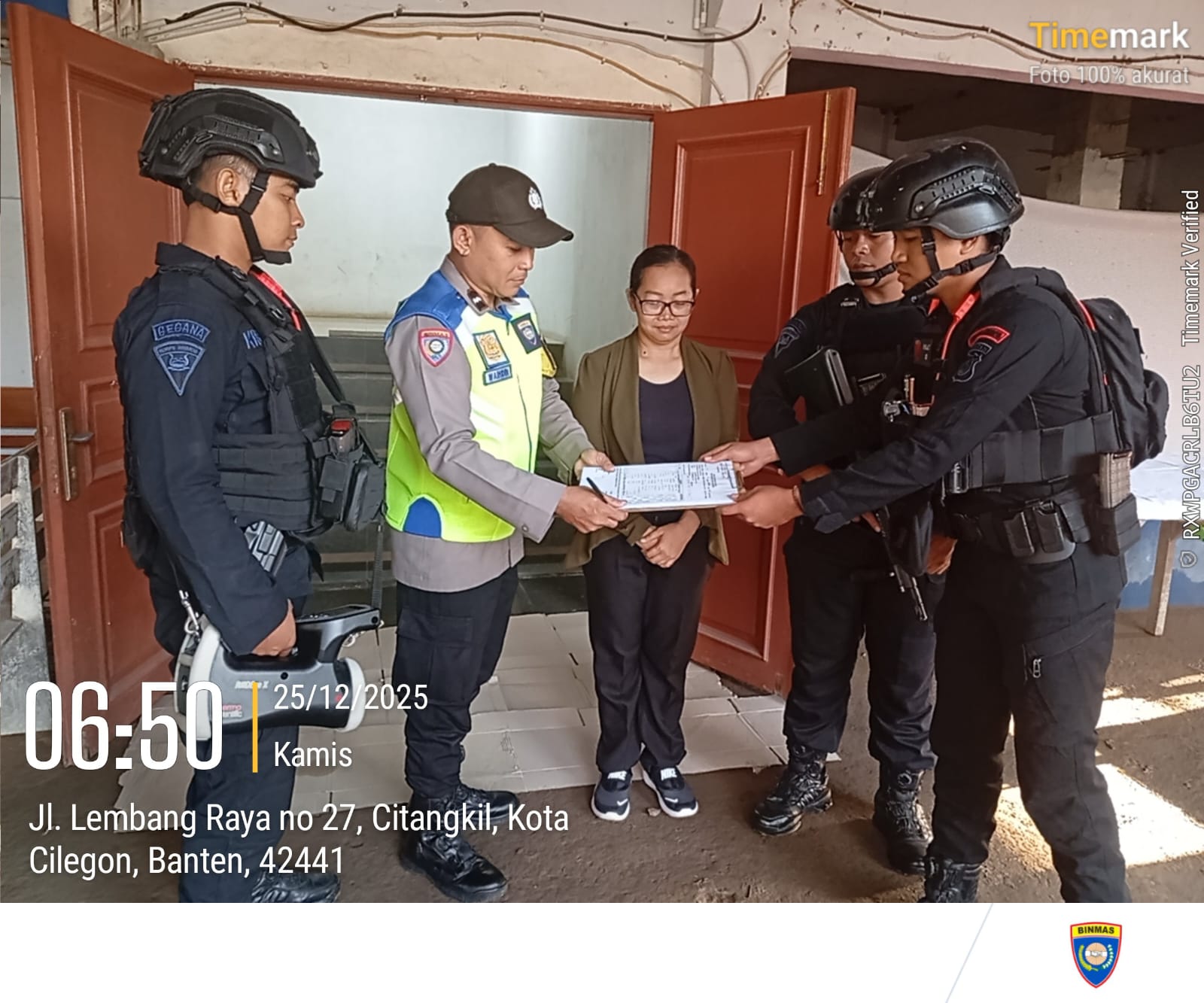 Kapolres Cilegon Polda Banten AKBP Dr. Martua Raja Taripar Laut Silitonga Melalui Kapolsek Ciwandan KOMPOL Andi Suherman Mengatakan Dalam rangka kegiatan ibadah Pera Natal Tahun 2025 yang dilaksanakan oleh jemaat rumah Doa GBI, Personil Polsek Ciwandan memberikan pelayanan pengamanan yang dimulai dengan melaksanakan sterilisasi manual dan dilanjutkan pengamanan kegiatan ibadah sampai rangkaian pelaksanaan ibadah selesai dilaksanakan.