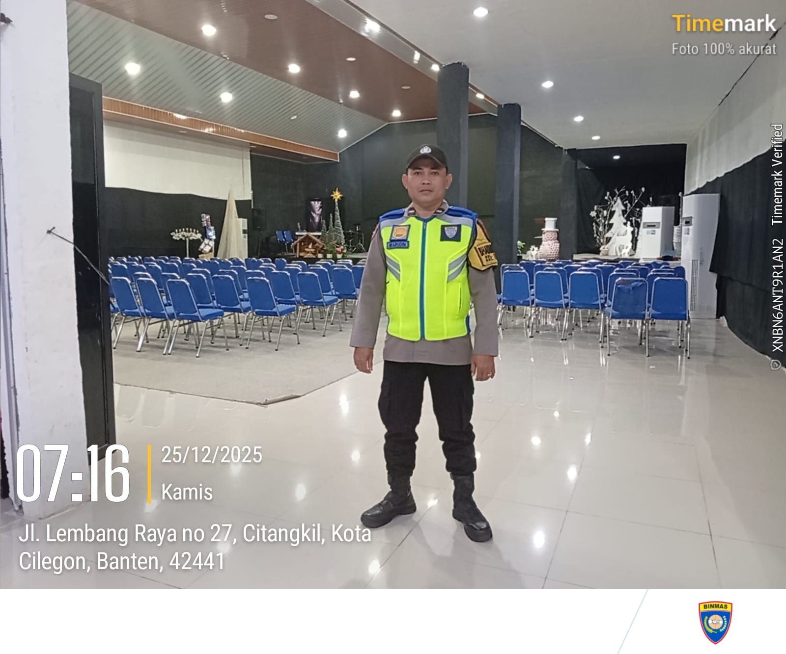Cilegon – Kapolsek Ciwandan Beserta Personil Polsek Ciwandan Polres Cilegon Polda Banten melaksanakan Pengamanan Tempat Ibadah Umat Kristiani pada kegiatan Ibadah Perayaan Natal Tahun 2023 Di Rumah Doa GBI Pimpinan Pdt. Paul Lingkungan Lembang RT. 002 RW. 004 Kecamatan Citangkil Kota Cilegon, Kamis (25/12/2025).