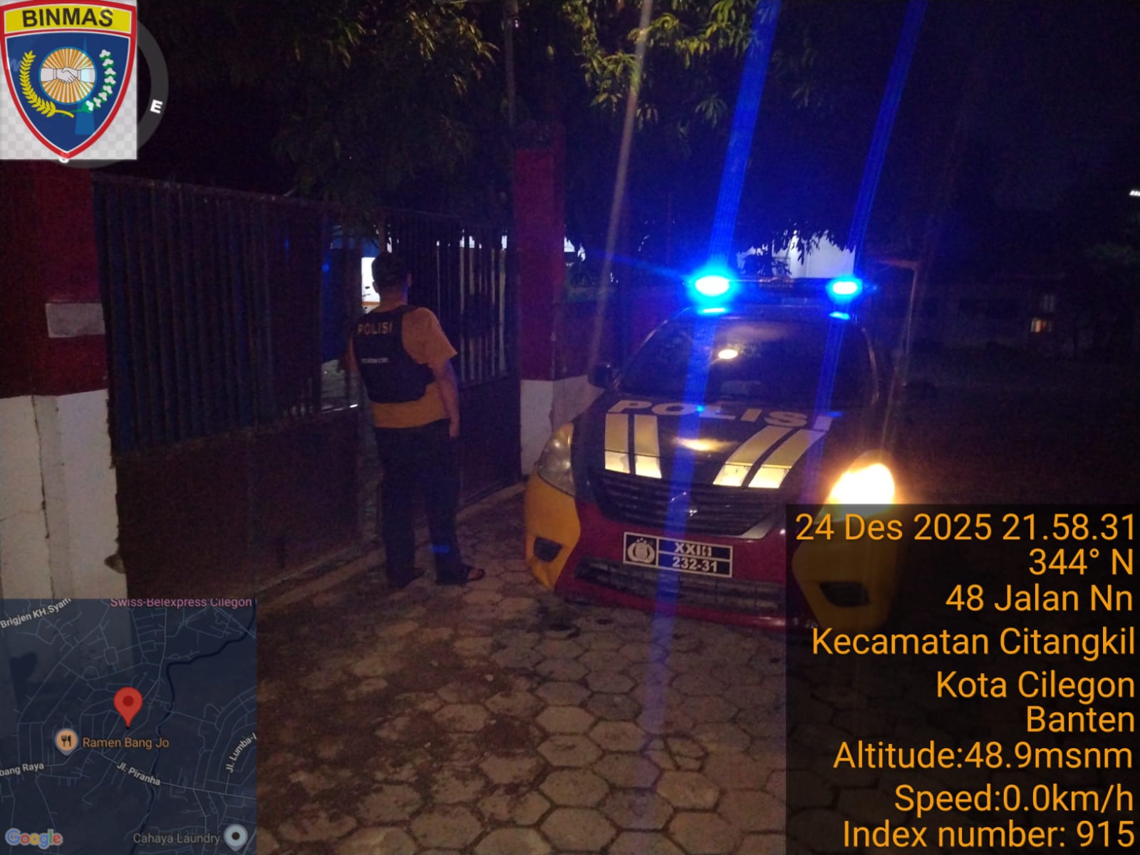 Cilegon - Personil Polsek Ciwandan Polres Cilegon Polda Banten Dalam Pelaksanaan Kegiatan Patroli dengan menyalakan lampu rotator berwarna biru di Daerah Hukum Polsek Ciwandan Polres Cilegon Polda Banten dari malam hingga dini hari, dalam rangka menciptakan situasi aman dan kondusif, Kamis (25/12/2025).