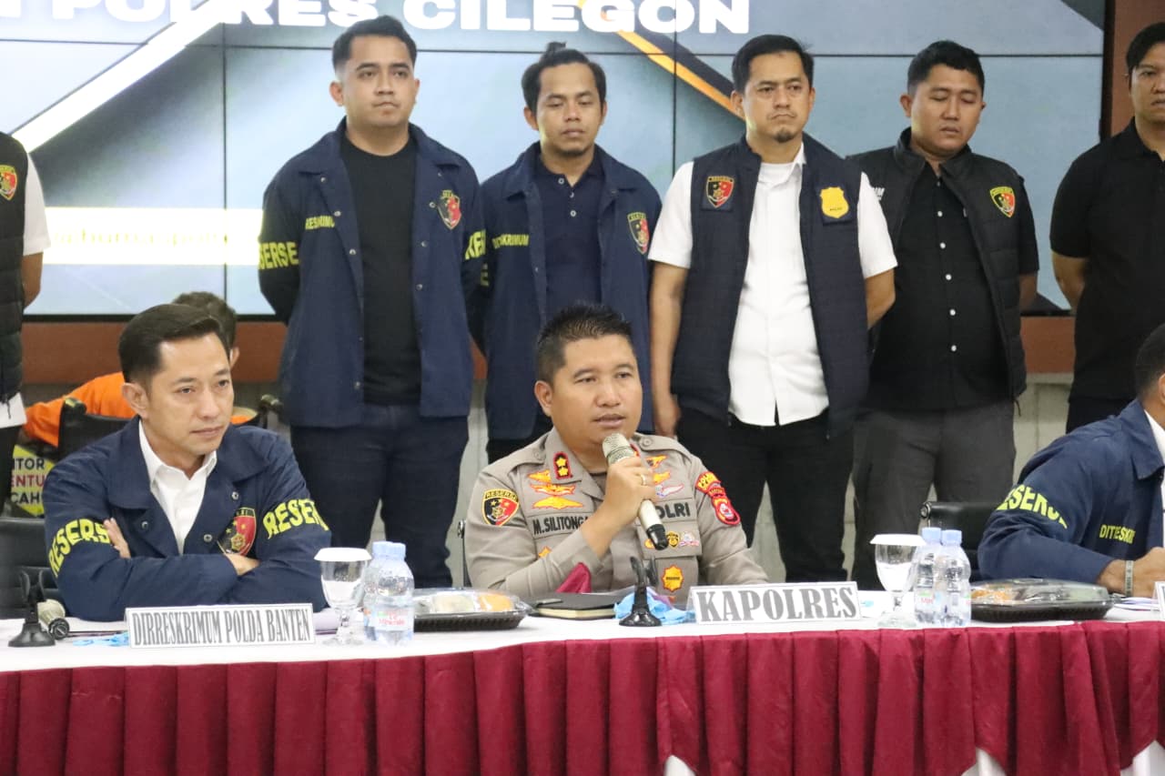 Press conference tersebut disampaikan oleh Ditreskrimum Polda Banten Kombes Pol Dian Setyawan didampingi Kapolres Cilegon AKBP Dr. Martua Raja Taripar Laut Silitonga, Plh. Kabid Humas Polda Banten AKBP Meryadi, Wakapolres Cilegon Kompol Arief Nazarudin, Kasubdit Jatanran Ditreskrimum Polda Banten Kompol Yeremia Iwo, Kasat Reskrim Polres Cilegon AKP Yoga Tama, Ka Instalasi Forensik Modikolegal RSUD Cilegon Dr. Baeti Adhayati SP FM, Puslabfor Polri Kompol Irfan Rofik.