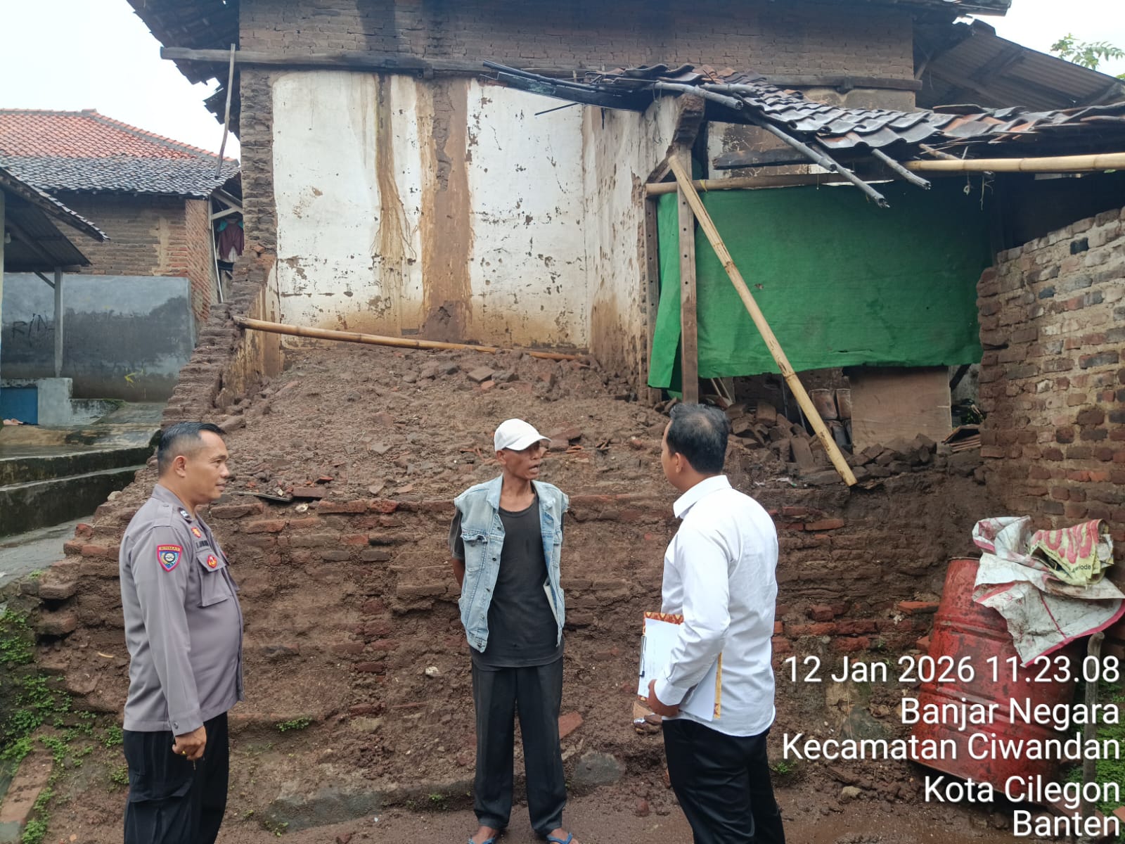 Cilegon - Personil Polsek Ciwandan Polres Ciegon Polda Banten Mengecek Dan Monitoring Sebuah rumah di Lingkungan Temugiring RT 002 RW 001 Kelurahan Banjarnegara Kecamatan Ciwandan Kota Cilegon Yang rubuh akibat hujan deras yang disertai angin pada Senin (12/01/2026).