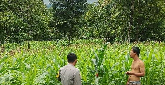 Dalam kegiatan monitoring ini, Bhabinkamtibmas meninjau langsung kondisi lahan jagung.