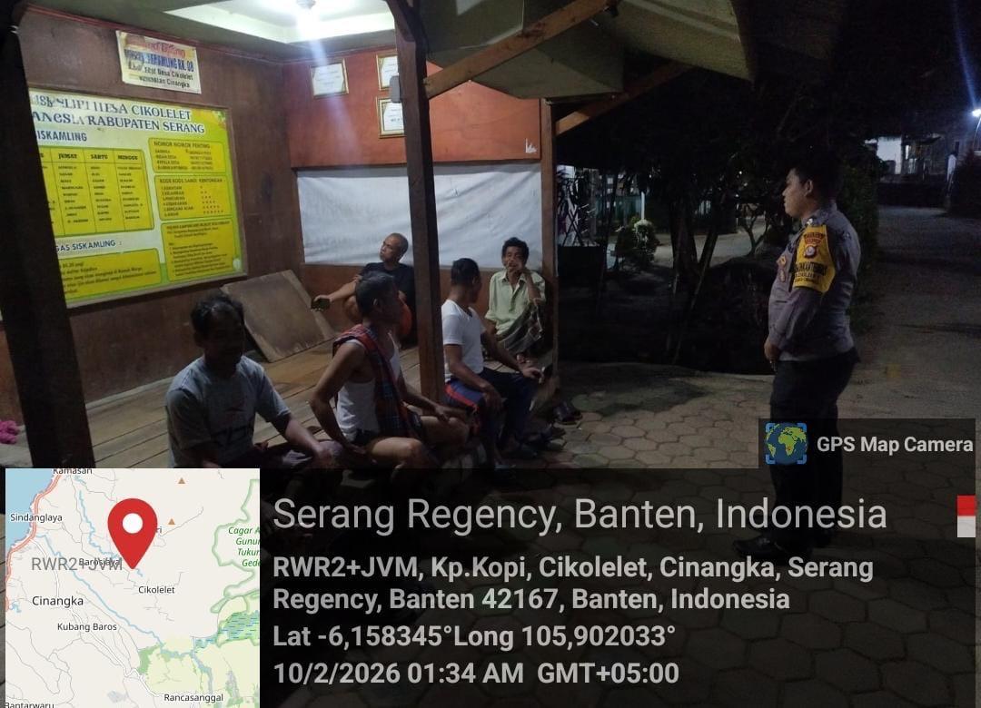 *Polres Cilegon* || Personel Bhabinkamtibmas Polsek Cinangka melaksanakan Program Komandan Wish Kapolda Banten RONDA SATKAMLING menyampaikan komunikasi dengan Petugas Siskamling agar berperan aktif dalam menciptakan Harkamtibmas yang aman dan Kondusif, Selasa (10/02/2026).