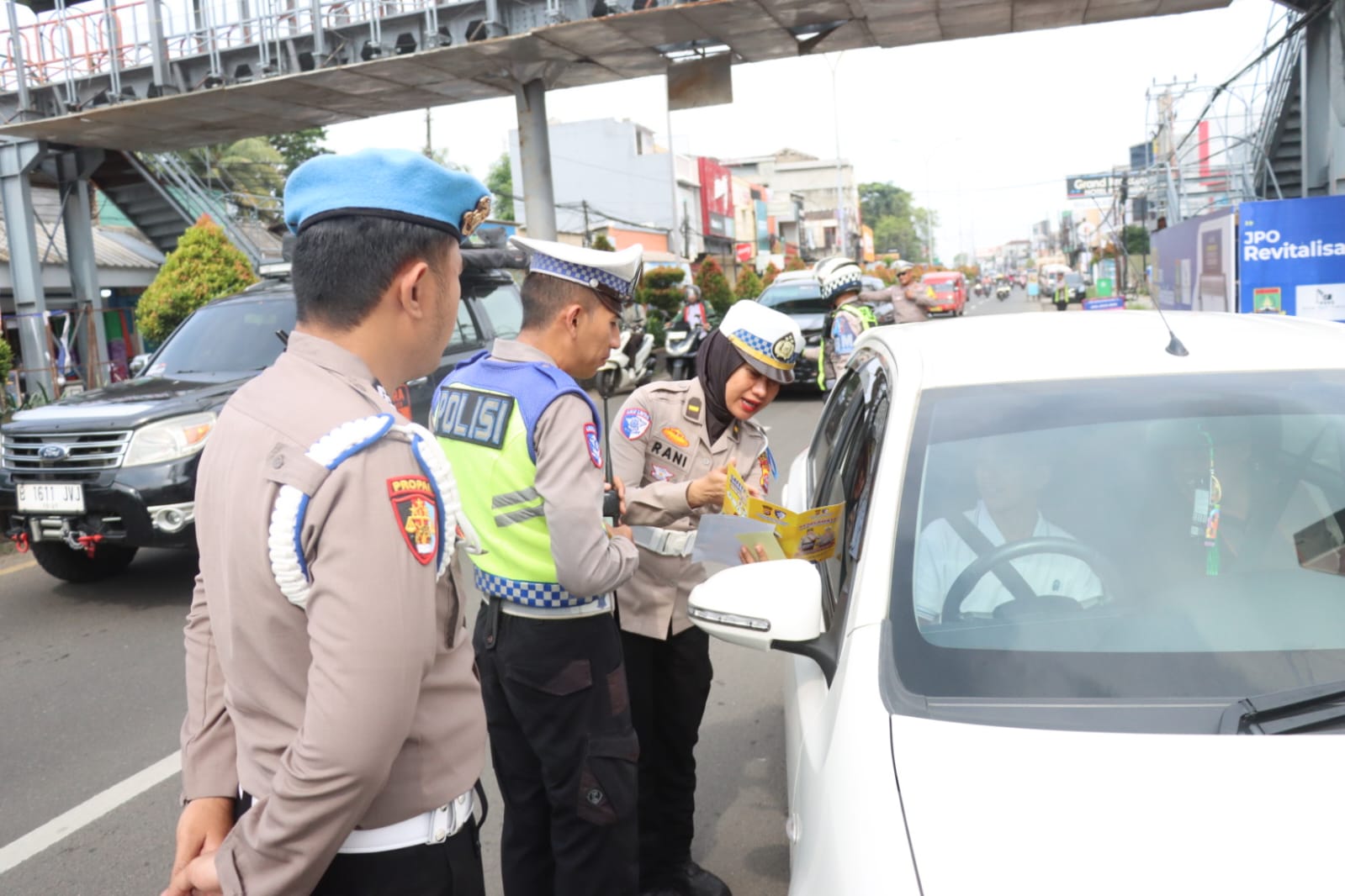 Petugas Sat Lantas Polres Cilegon memberikan edukasi langsung kepada masyarakat terkait pentingnya mematuhi peraturan lalu lintas, menggunakan helm SNI, melengkapi surat-surat kendaraan, serta mengutamakan keselamatan dalam berkendara.
