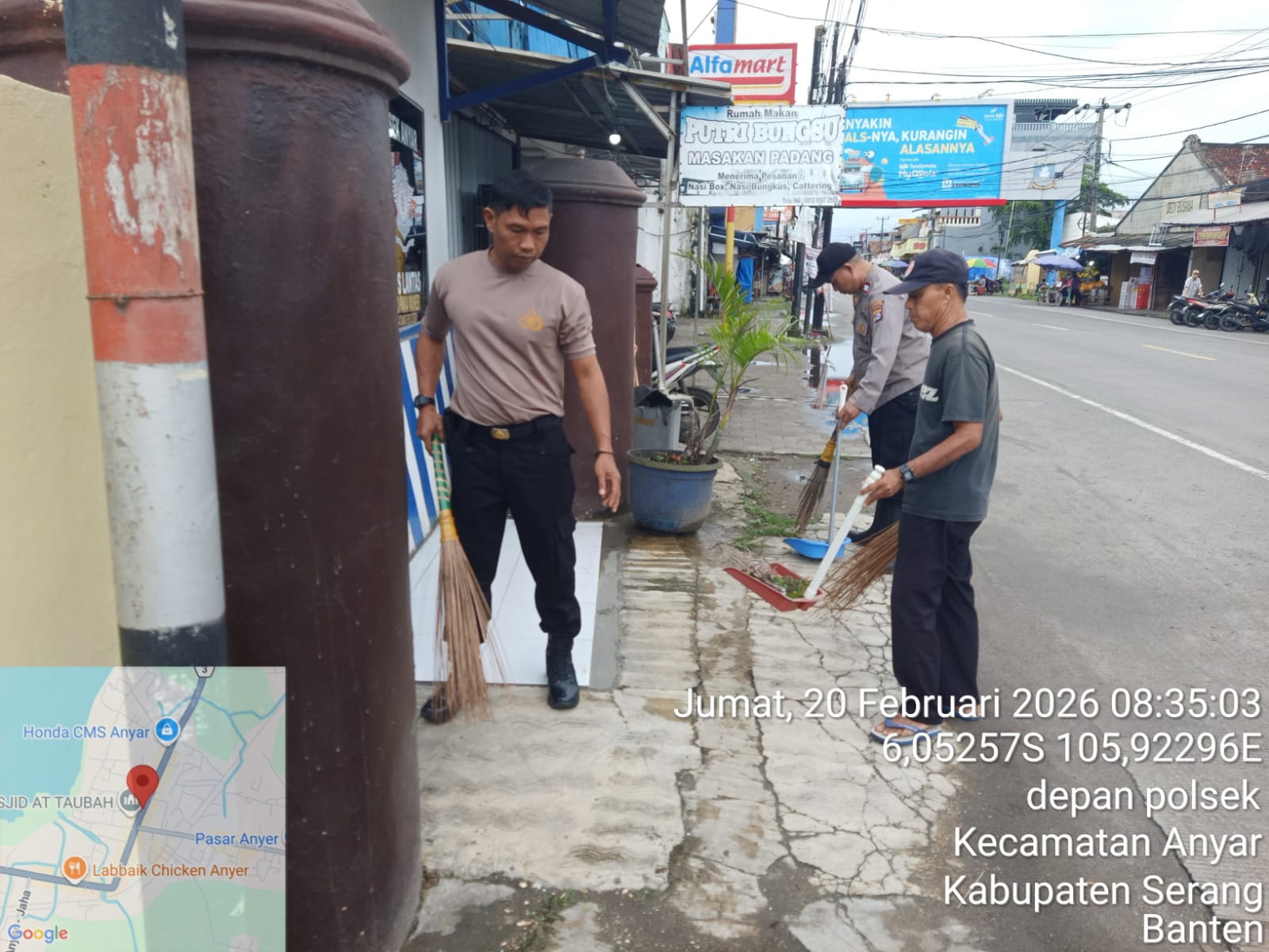 Anggota Polsek Anyar melaksanakan kegiatan Jumat Bersih di sekitar lingkungan Markas Komando (Mako) Polsek Anyar. Jumat (20/02/2026)