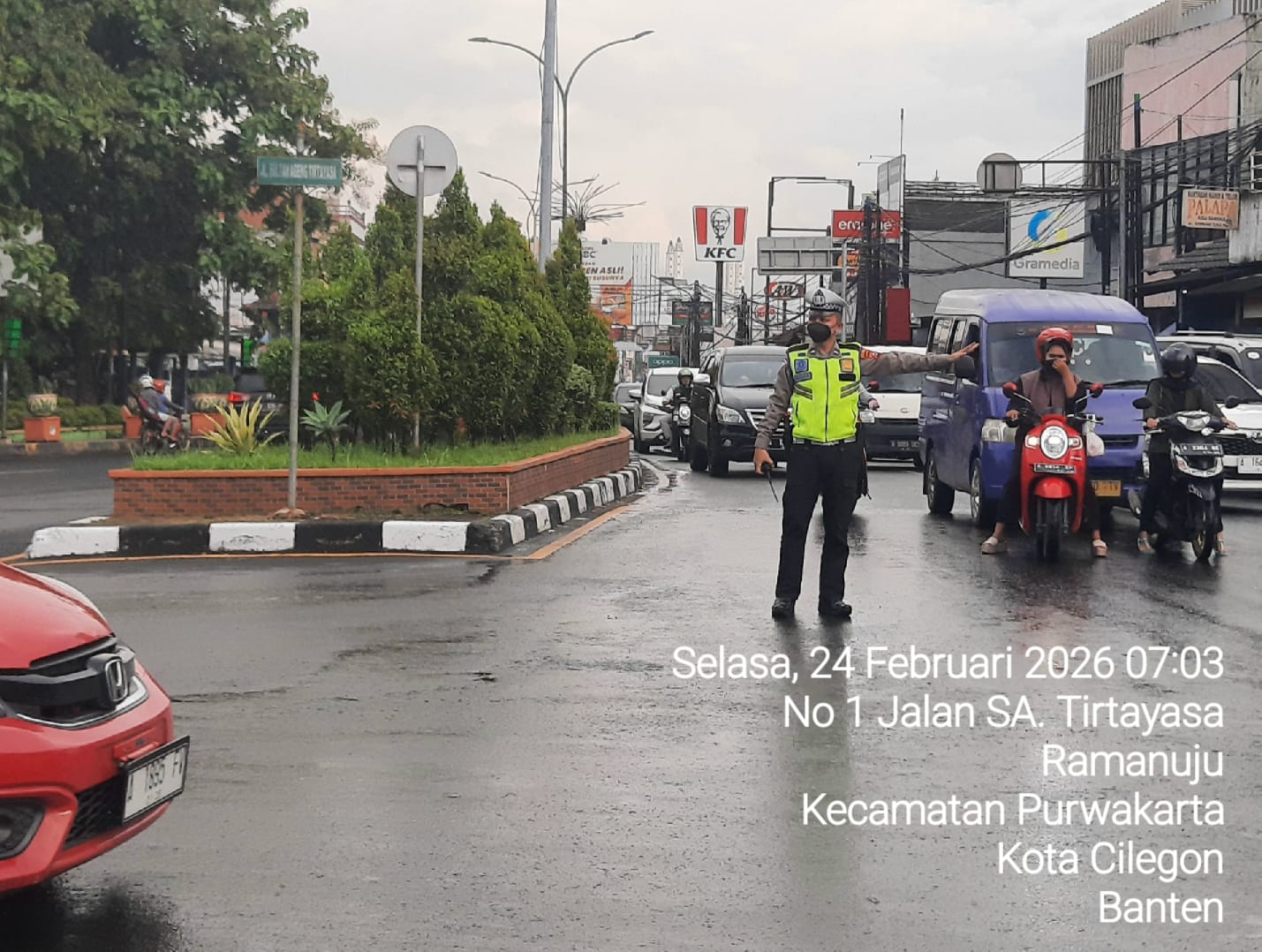 Cilegon, Satlantas Polres Cilegon Polda Banten – Berikan pelayanan kepada masyarakat Kasat lantas Polres Cilegon AKP Ridwan memerintahkan jajaran lalulintas untuk melaksanakan pengaturan lalu lintas di penggal – penggal jalan yang rawan kemacetan di Kota Cilegon, (Selasa,24/2/2026)