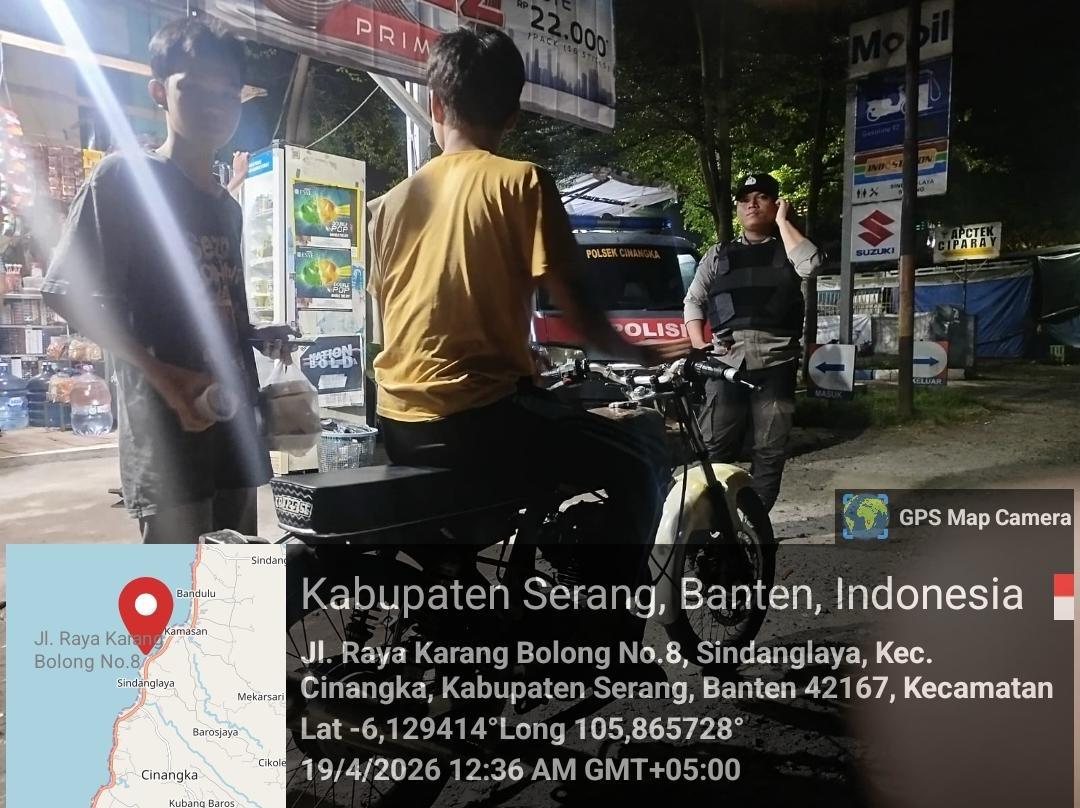 *Cilegon* – Dalam Rangka Pencegahan Kejahatan Jalanan dan Memelihara situasi keamanan dan menjaga serta memberikan rasa aman dan nyaman di masyarakat,Salah satu upaya untuk mewujudkan hal tersebut sebagaimana yang dilakukan oleh Personil Polsek Cinangka Polres Cilegon Polda Banten melaksanakan giat patroli blue light malam hari hingga menjelang pagi, Minggu (19/04/2026).