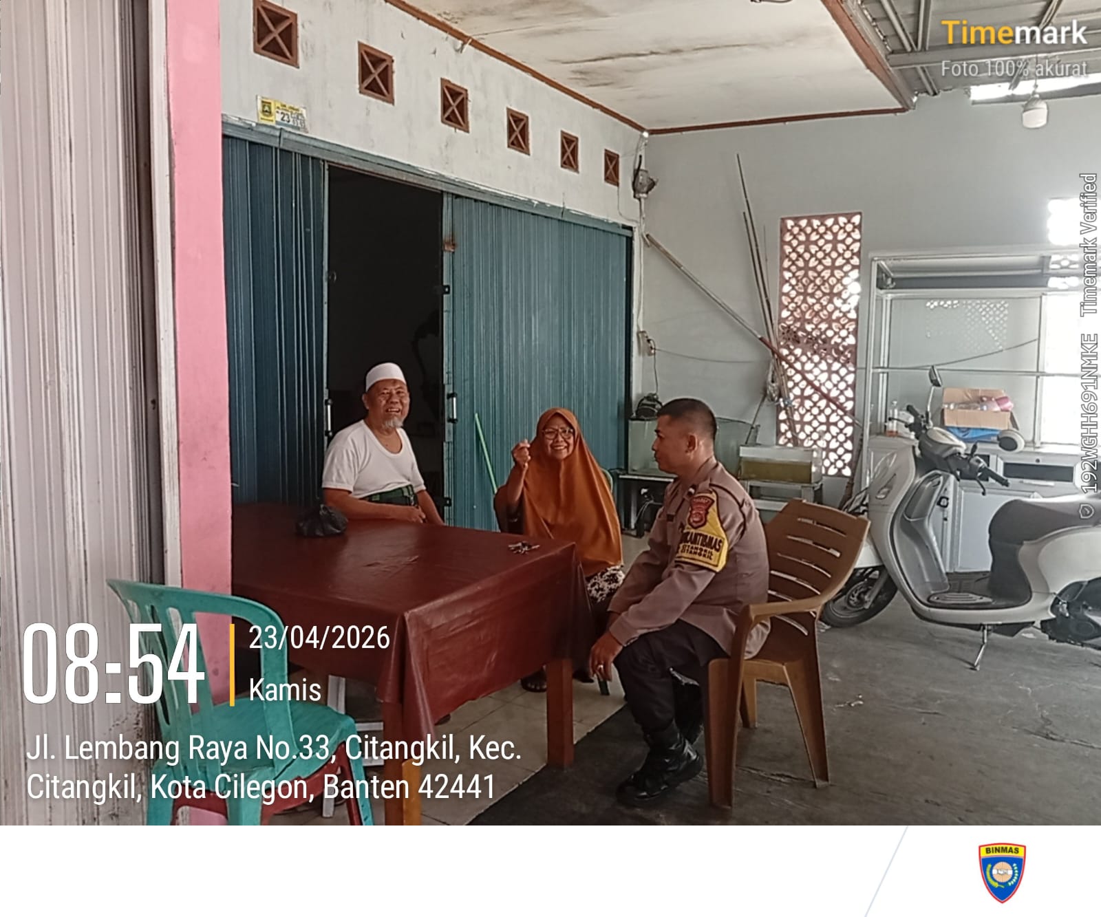 Cilegon - Bhabinkamtibmas Polsek Ciwandan Polres Cilegon Polda Banten Menyapa warga serta Ajak warga Binaannya untuk berperan aktif jaga keamanan lingkungan serta jalin komunikasi agar tercipta situasi aman di daerah hukum Polsek Ciwandan Polres Cilegon Polda Banten, Kamis (23/04/2026).