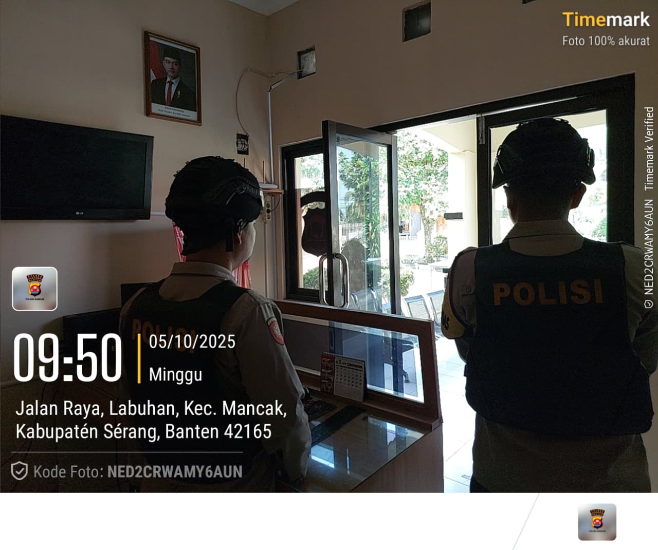“Anggota piket jaga Polsek Mancak AIPTU DODIK SOFYAN dan AIPDA ZIAN NOOR Z  melaksanakan Sispam Mako dilengkapi dengan bodyvest, helm kevlar, dan senjata api salah satu upaya peningkatan kemanan mako guna mencegah hal-hal yang tidak dapat di duga selama pelayan berlangsung.”