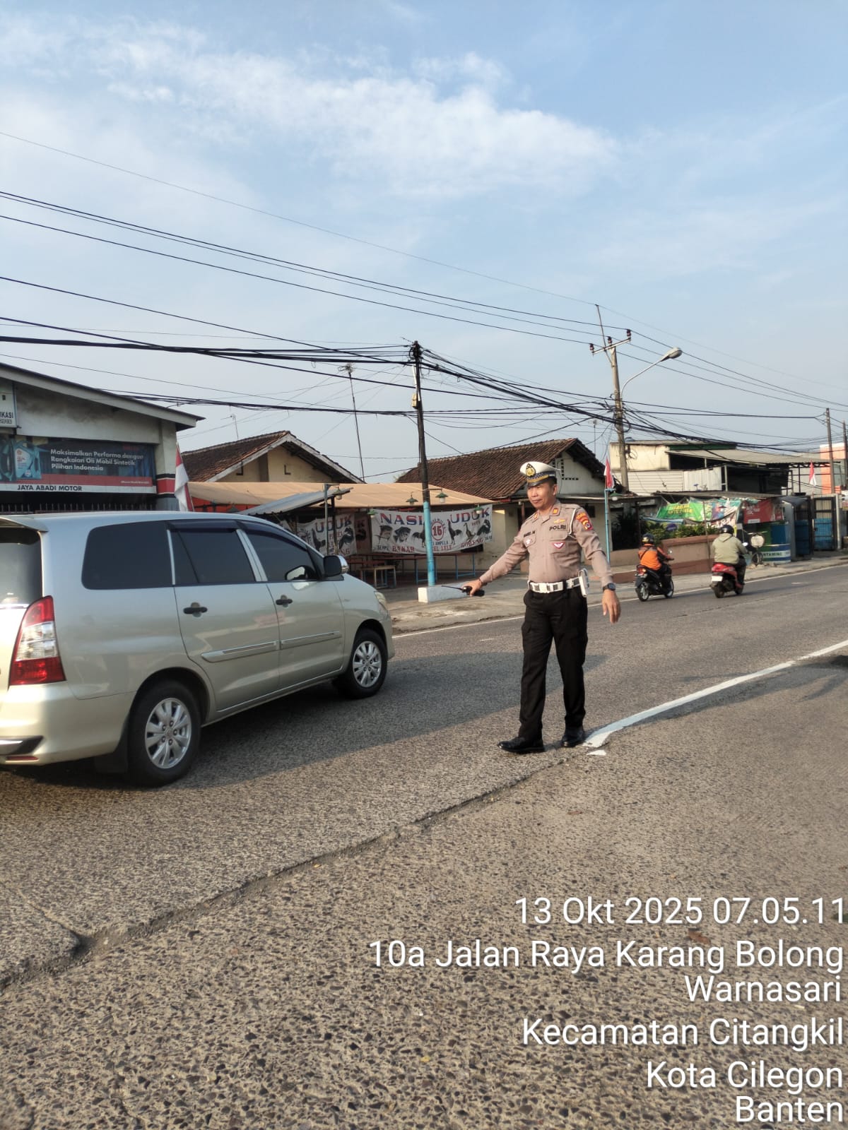 Cilegon - Personil  Polsek Ciwandan Polres Cilegon Polda Banten melaksanakan giat Strong Poin Pengaturan Lalu Lintas Disimpang Brown Kelurahan Gunung Sugih guna menciptakan ketertiban, keamanan dan Kelancaran Lalu-lintas bagi masyarakat, Senin (13/10/2025).
