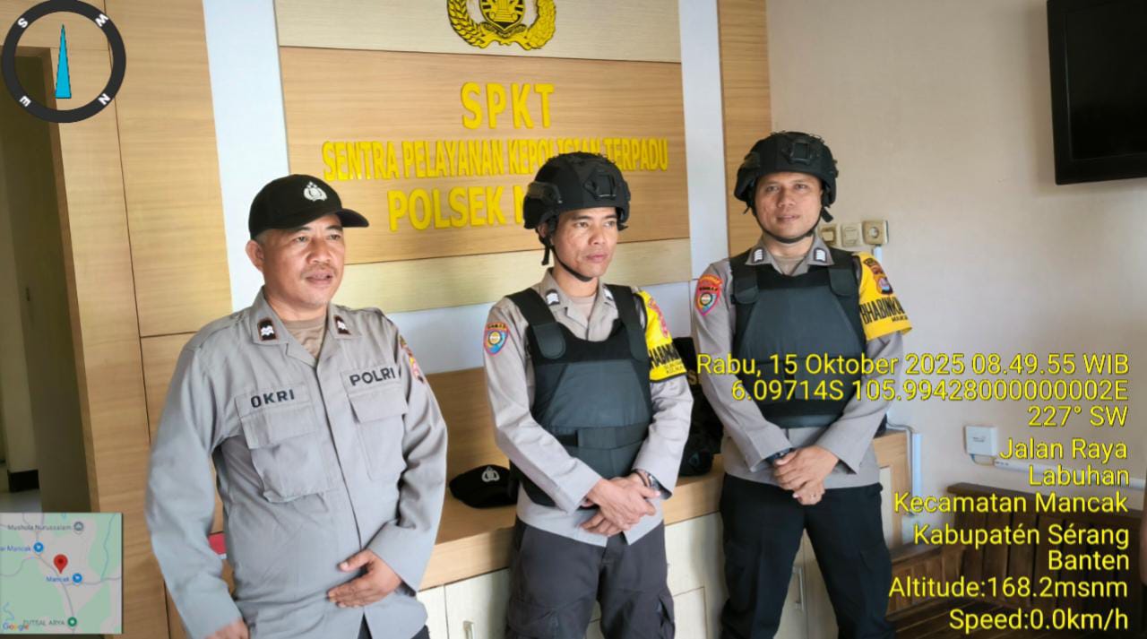 “Anggota piket jaga Polsek Mancak AIPTU OKRIANTO, BRIPKA DARSIWAN, BRIPKA ARIE SUFRIADI, BRIGADIR AGAM WICAKSONO. melaksanakan Sispam Mako dilengkapi dengan bodyvest, helm kevlar, dan senjata api  serta melakukan cek tahanan  2 orang, dan ini salah satu upaya peningkatan kemanan mako guna mencegah hal-hal yang tidak dapat di duga selama pelayan berlangsung.”