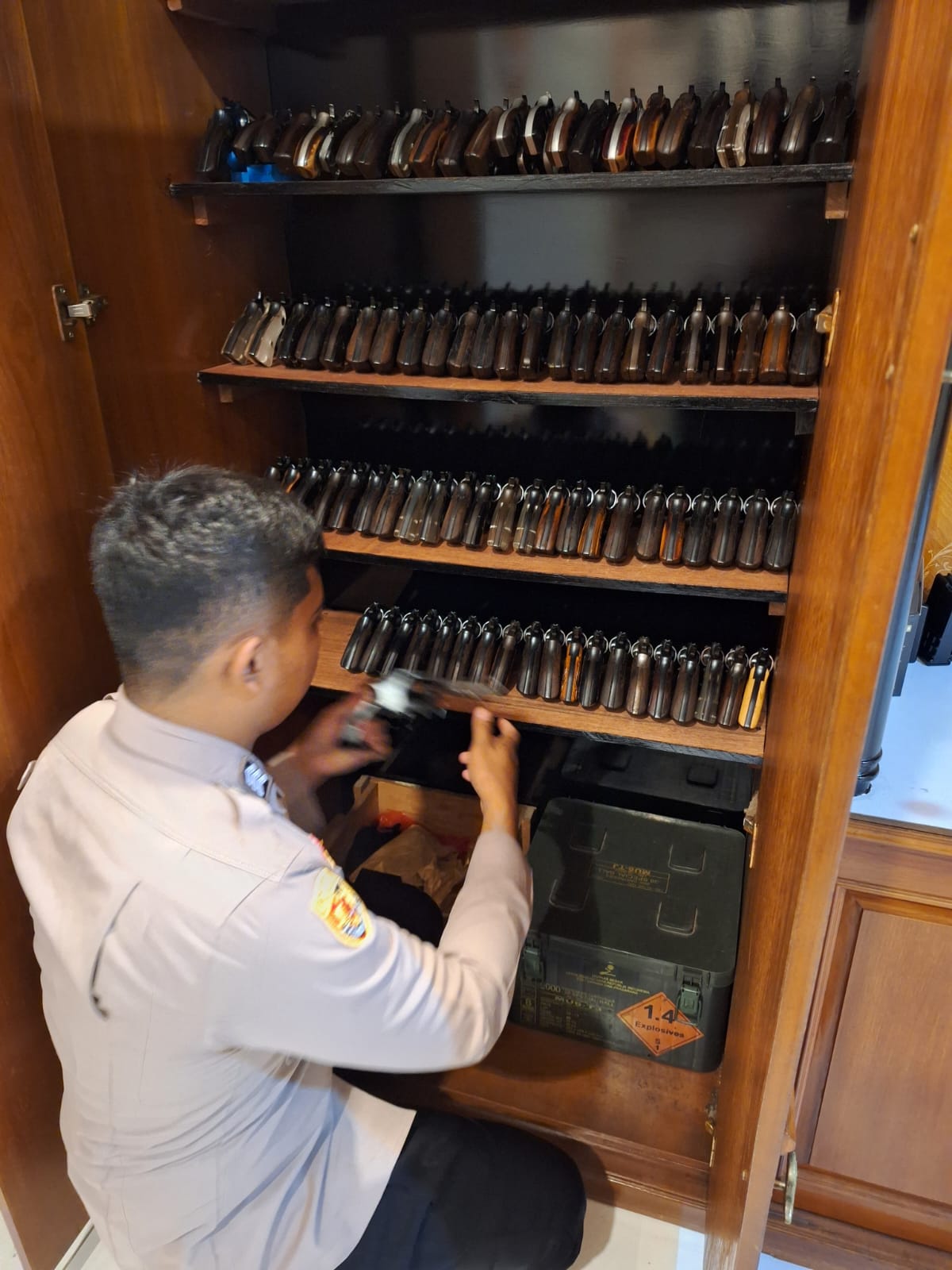 ANGGOTTA STAFF LOGISTIK MEMBERSIHKAN SENJATA DAN PENGECEKAN SENJATA API DI GUDANG
