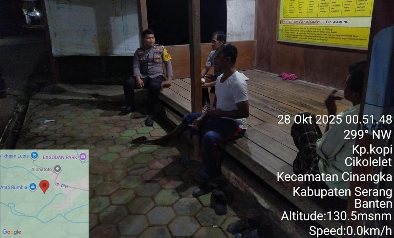 *Polres Cilegon* || Personel Bhabinkamtibmas Polsek Cinangka melaksanakan Program Komandan Wish Kapolda Banten RONDA SATKAMLING menyampaikan komunikasi dengan Petugas Siskamling agar berperan aktif dalam menciptakan Harkamtibmas yang aman dan Kondusif, Selasa (28/10/2025).