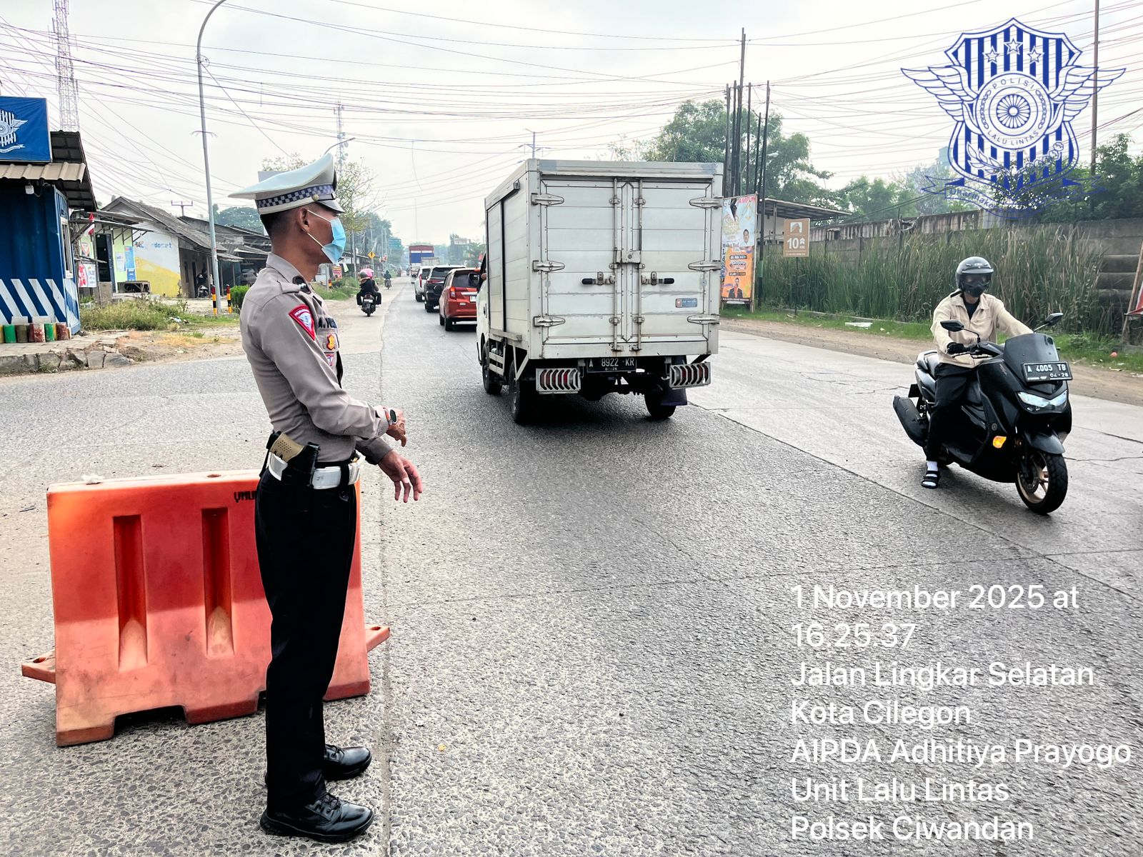 Personil Polsek Ciwandan melakukan pengaturan lalu lintas di depan Pos Lantas JLS Ciwandan dan peneguran terhadap pelanggaran kasat mata. Kegiatan ini dilaksanakan untuk memastikan keamanan dan kelancaran arus lalu lintas di wilayah hukum Polsek Ciwandan.