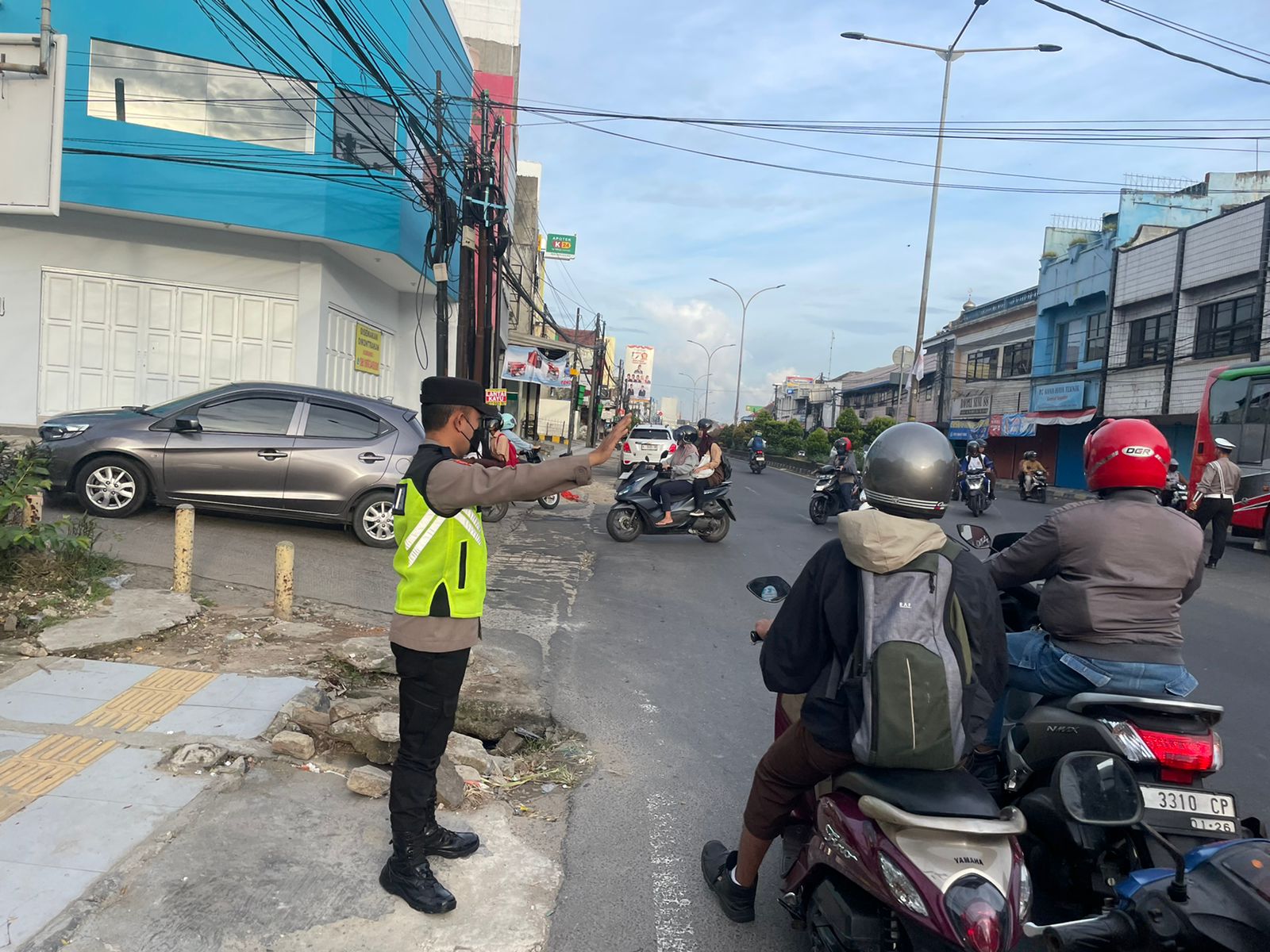 Cilegon,Polres Cilegon Polda Banten Pada Hari Senin/24/11/2025 Pukul 06.30 Wib, Personil Siwas Polres Cilegon, Brigadir Hadi Sudrajat melaksanakan kegiatan pengaturan arus lalu lintas di Jalur Protokol jalan utama Kota Cilegon.