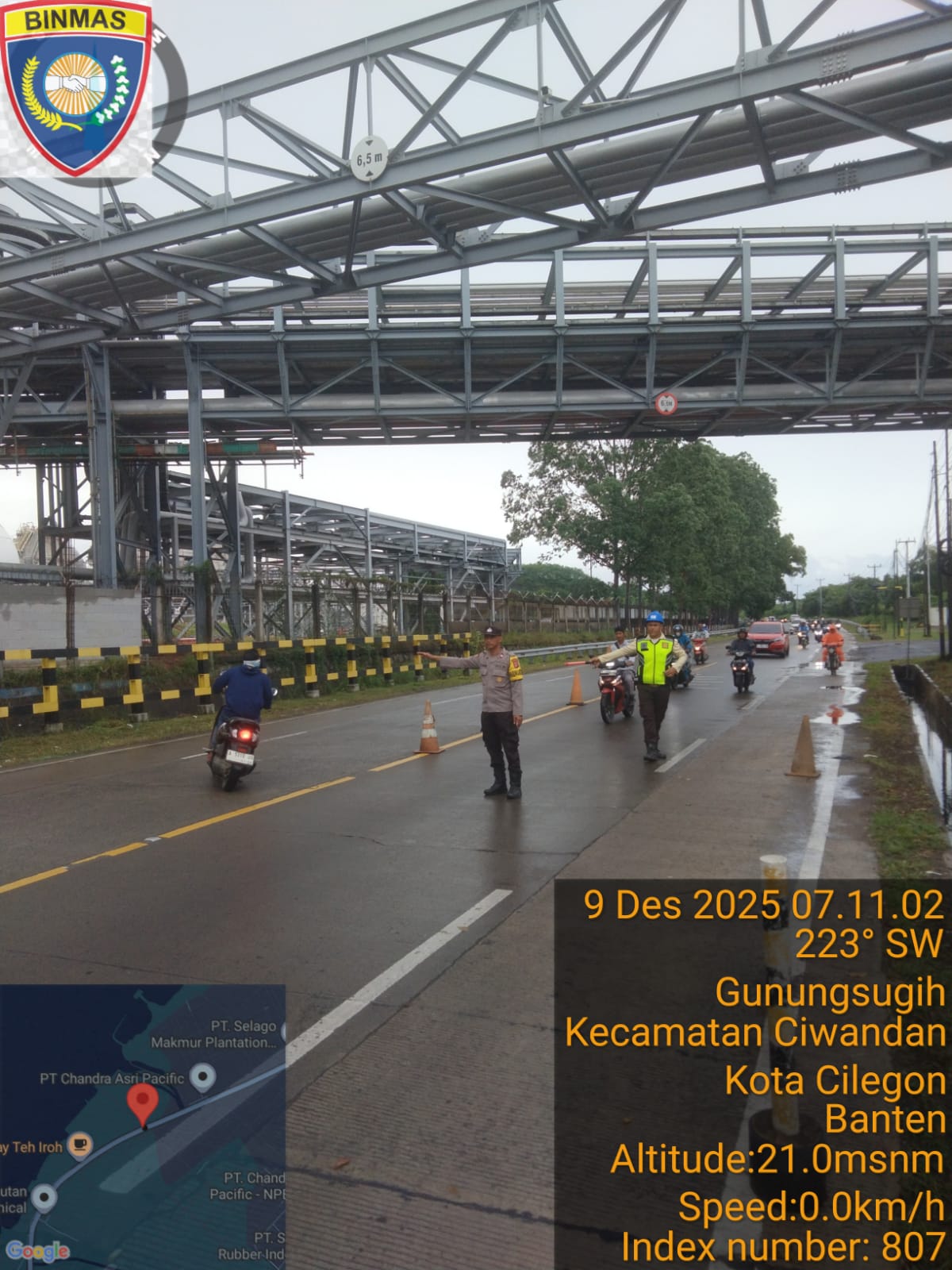 Cilegon - Personil Polsek Ciwandan Polres Cilegon Polda Banten melaksanakan giat Strong Poin Pengaturan Lalu Lintas Disimpang Brown Kelurahan Gunung Sugih guna menciptakan ketertiban, keamanan dan Kelancaran Lalu-lintas bagi masyarakat, Senin (08/12/2025).