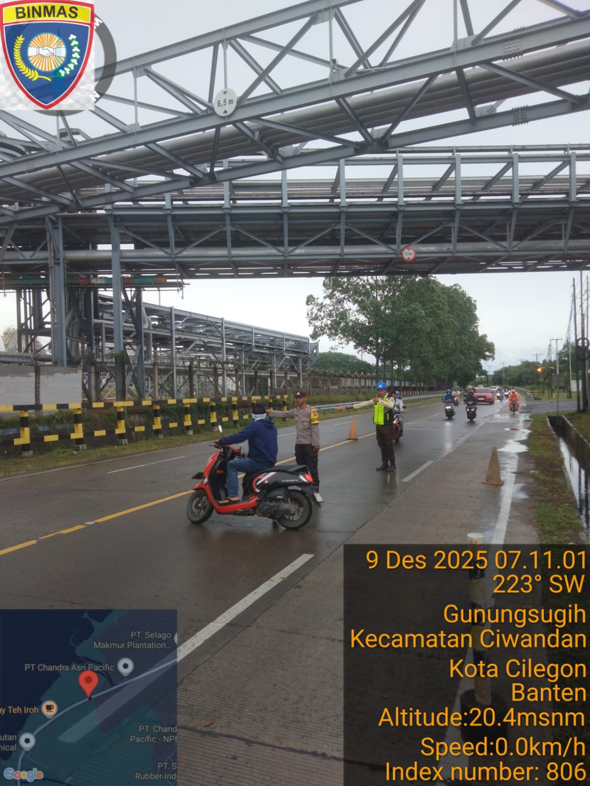Cilegon - Personil Polsek Ciwandan Polres Cilegon Polda Banten melaksanakan giat Strong Poin Pengaturan Lalu Lintas Disimpang Brown Kelurahan Gunung Sugih guna menciptakan ketertiban, keamanan dan Kelancaran Lalu-lintas bagi masyarakat, Senin (08/12/2025).