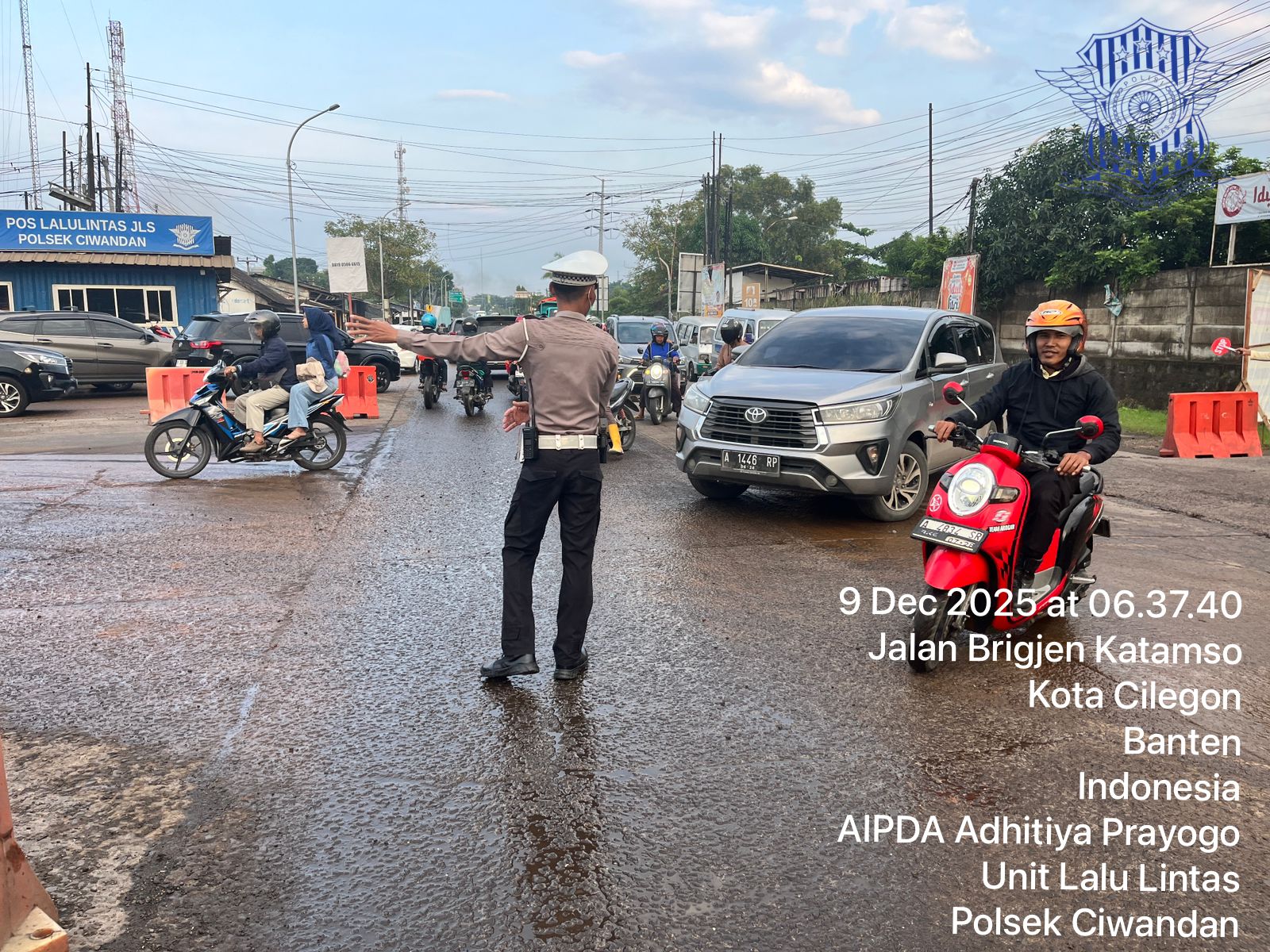 Cilegon - Personil  Polsek Ciwandan Polres Cilegon Polda Banten melaksanakan giat Strong Poin Pengaturan Lalu Lintas Disimpang Brown Kelurahan Gunung Sugih guna menciptakan ketertiban, keamanan dan Kelancaran Lalu-lintas bagi masyarakat, Senin (08/12/2025).
