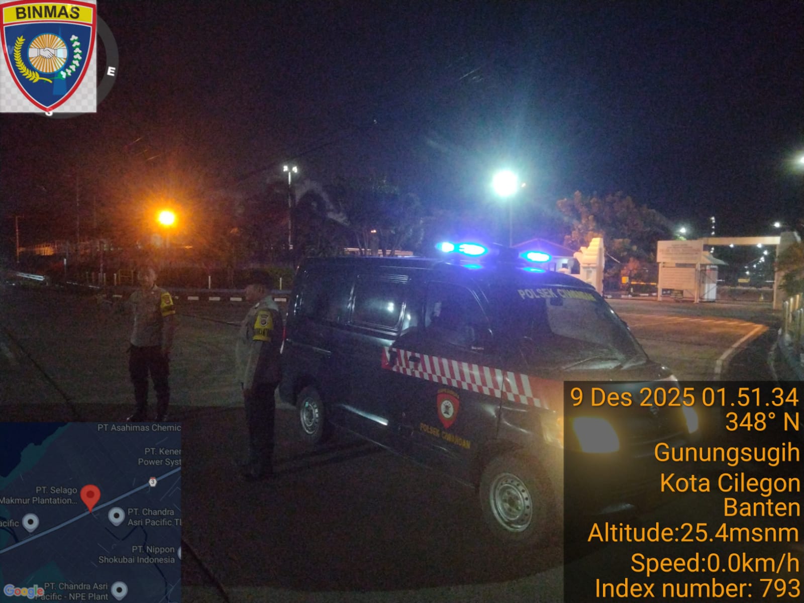 Cilegon - Personil Polsek Ciwandan Polres Cilegon Polda Banten Dalam Pelaksanaan Kegiatan Patroli dengan menyalakan lampu rotator berwarna biru di Daerah Hukum Polsek Ciwandan Polres Cilegon Polda Banten dari malam hingga dini hari, dalam rangka menciptakan situasi aman dan kondusif, Senin (08/12/2025).