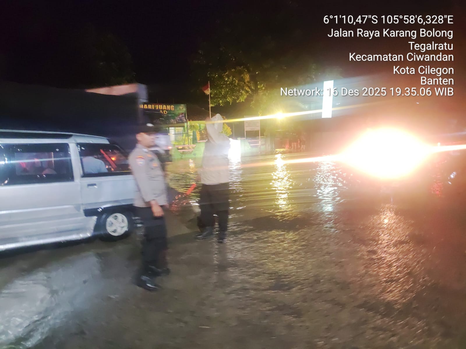Cilegon - Personil Polsek Ciwandan melaksanakan monitoring genangan air dampak cuaca hujan lebat di wilayah hukum Polsek Ciwandan, Selasa (16/12/2025).